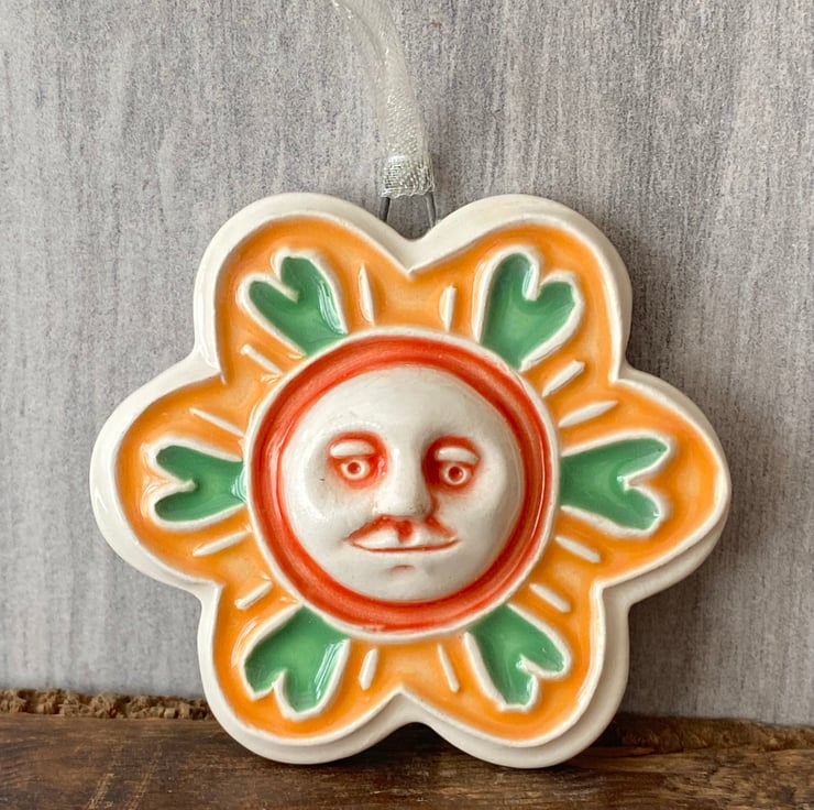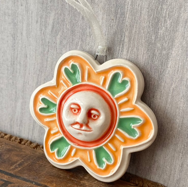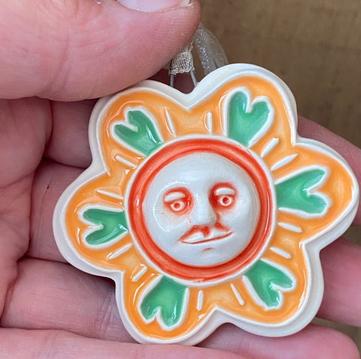 This unusual flower decoration is made from white earthenware clay and has a little moon face in the centre.It has been fired twice, once to the bisque stage and then a second firing for the glossy glaze. It measures 6 centimetres wide x 5cm height x 1cm thick and hangs from a cream organza ribbon.