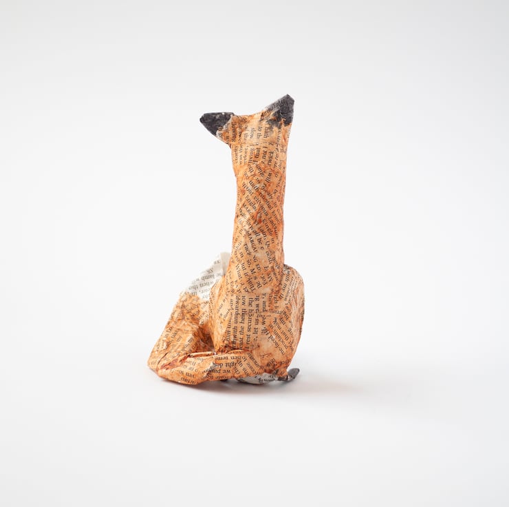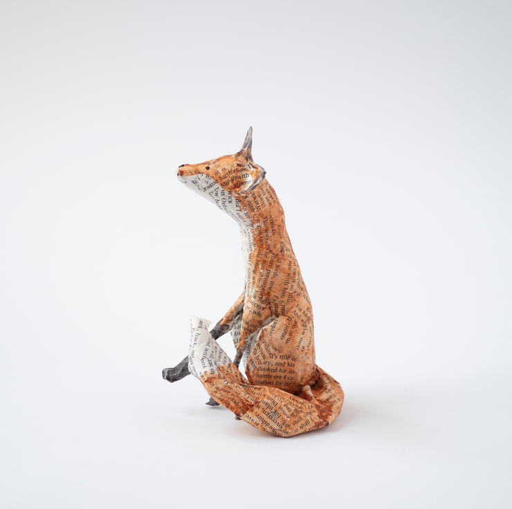 A handmade paper mache folk art sculpture of a sitting fox. It is created from paper mache using book paper, wire and watercolour and is approx 12.5cm high. Made with newspaper, wire, glue, pages from Shakespeare, and watercolour paint.