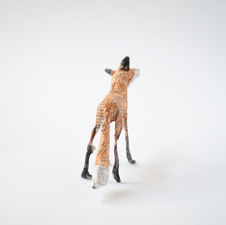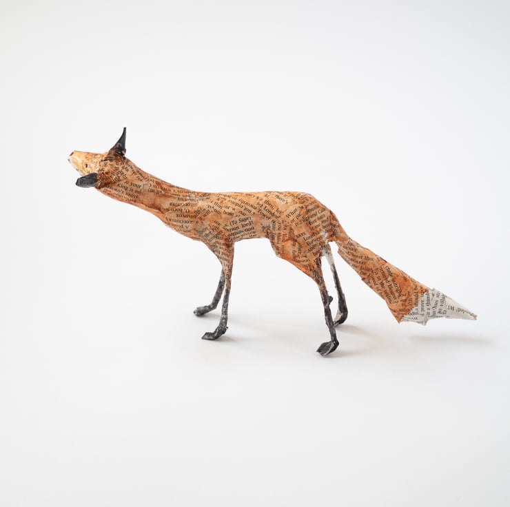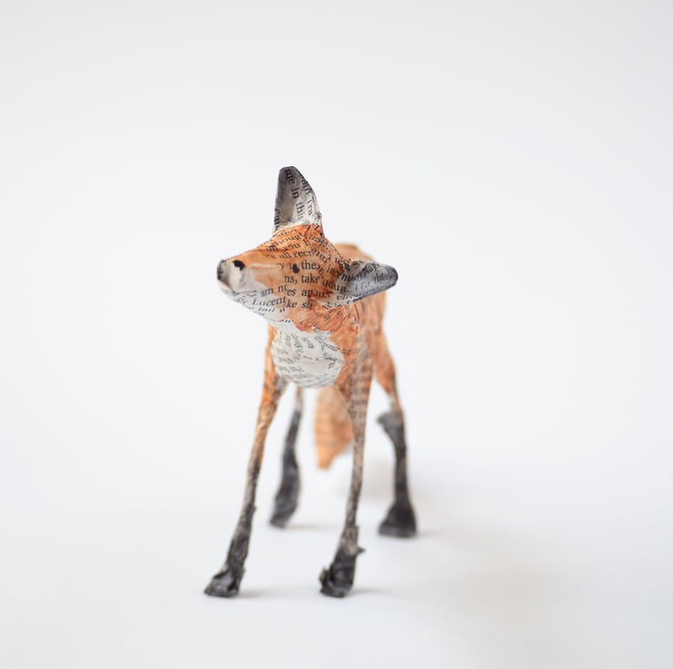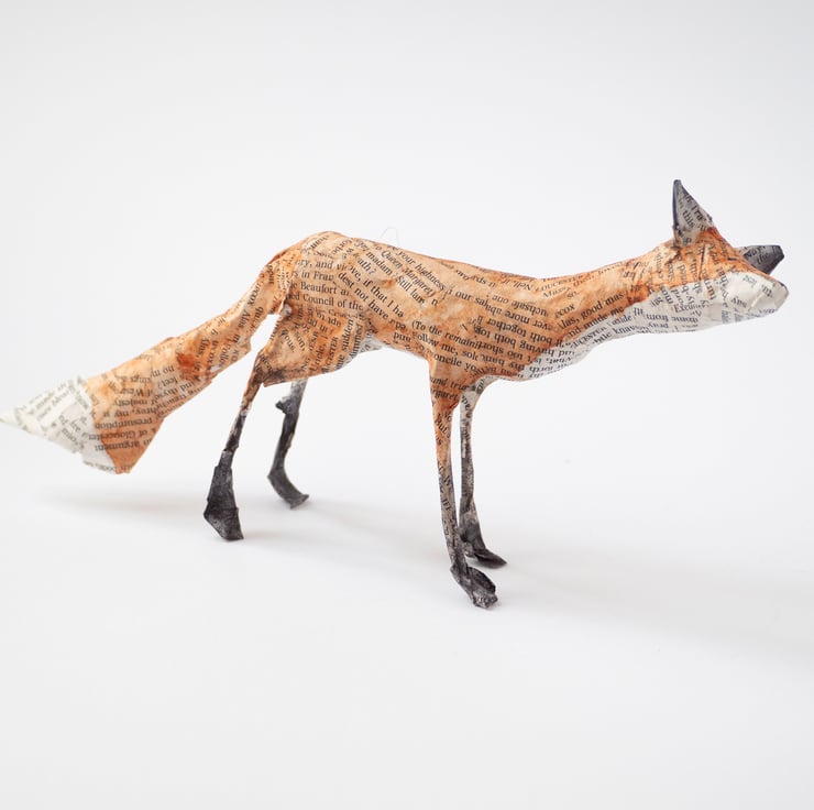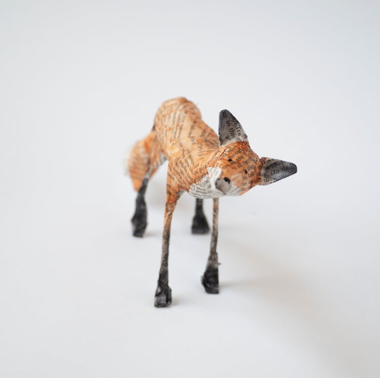 A handmade paper mache folk art sculpture of a standing fox. It is created from paper mache using book paper, wire and watercolour and is approx 11cm high and 21cm long. Made with newspaper, wire, glue, pages from Shakespeare, and watercolour paint.