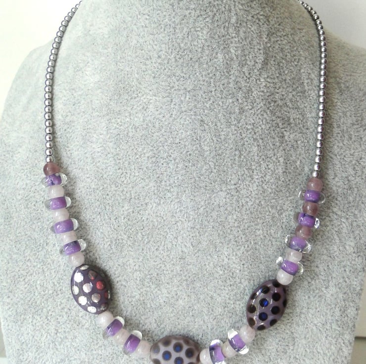 Necklace in shades of lilac 3 unique spotted focal beads in different hues of lilac
