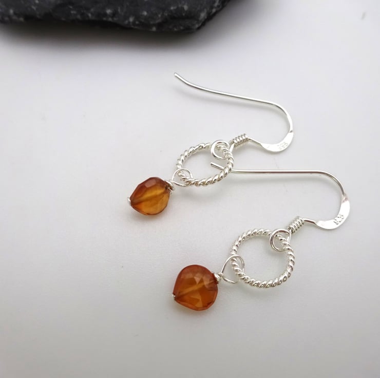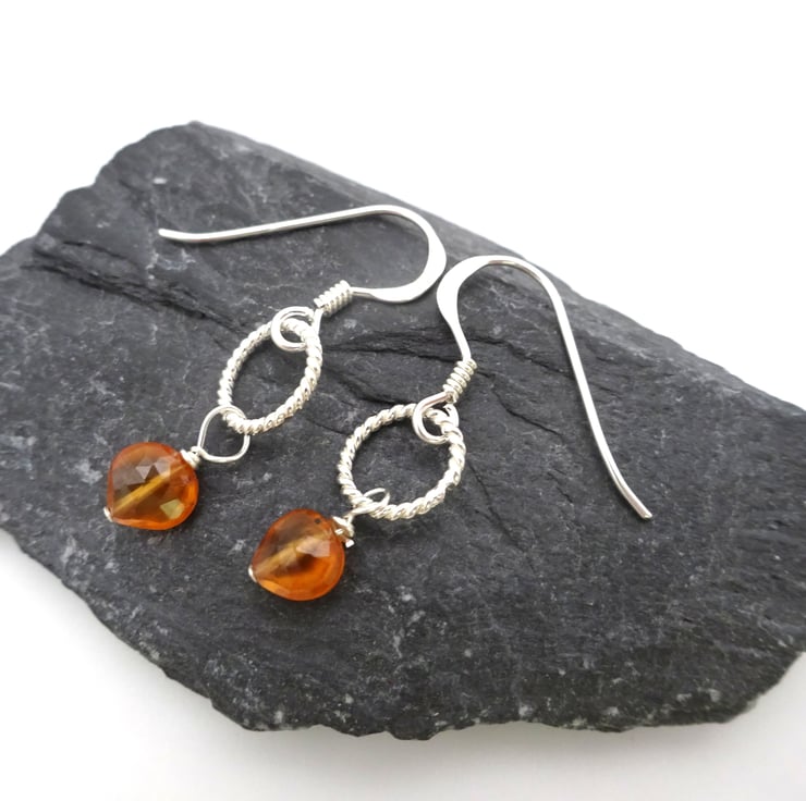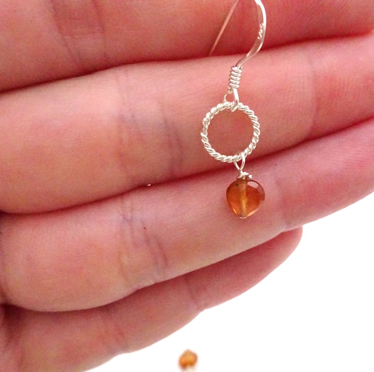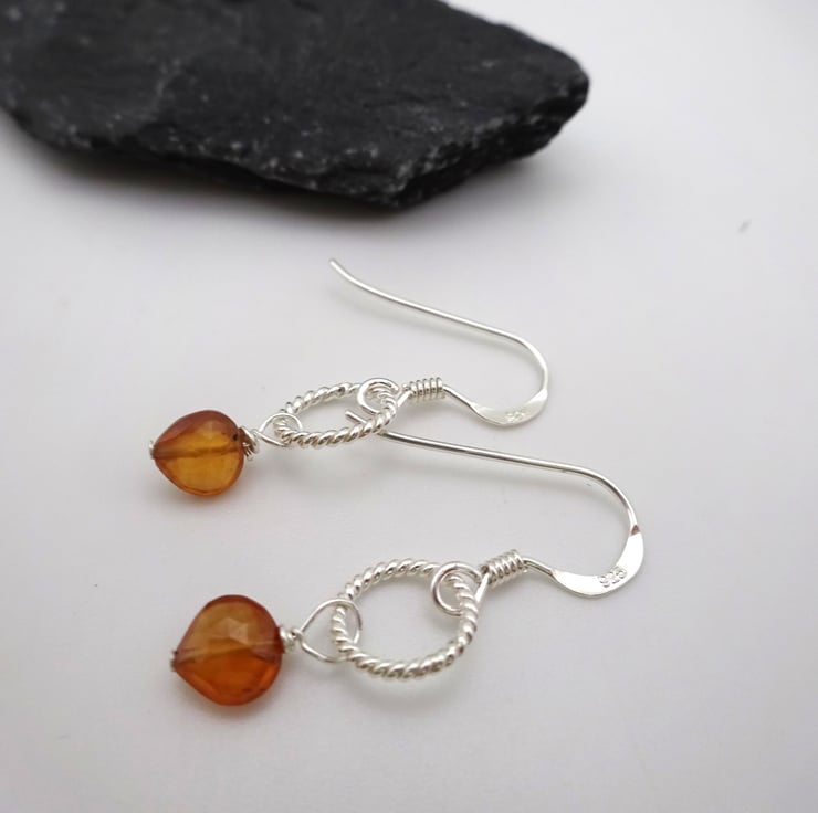 A pair of sterling silver earrings featuring Spessartine Garnet gemstone beads and silver hoops.