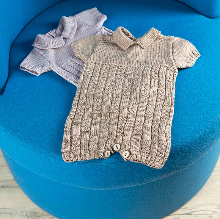 Cute Lilac Collared Baby Overall/Romper 0-3 months made from beautiful Lang Yarns baby yarn.