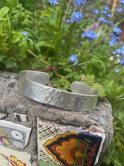 I am inspired by the textures and forms of nature, this cuff is very comfortable and its handmade hammered finish reminds me of the way moonlight is reflected in water. I loved making it!