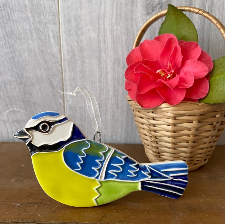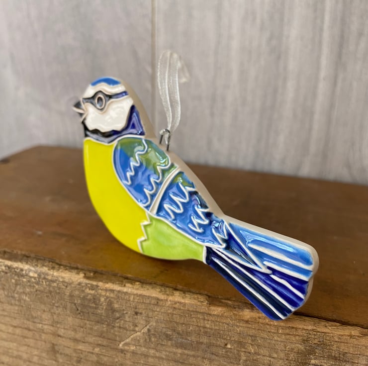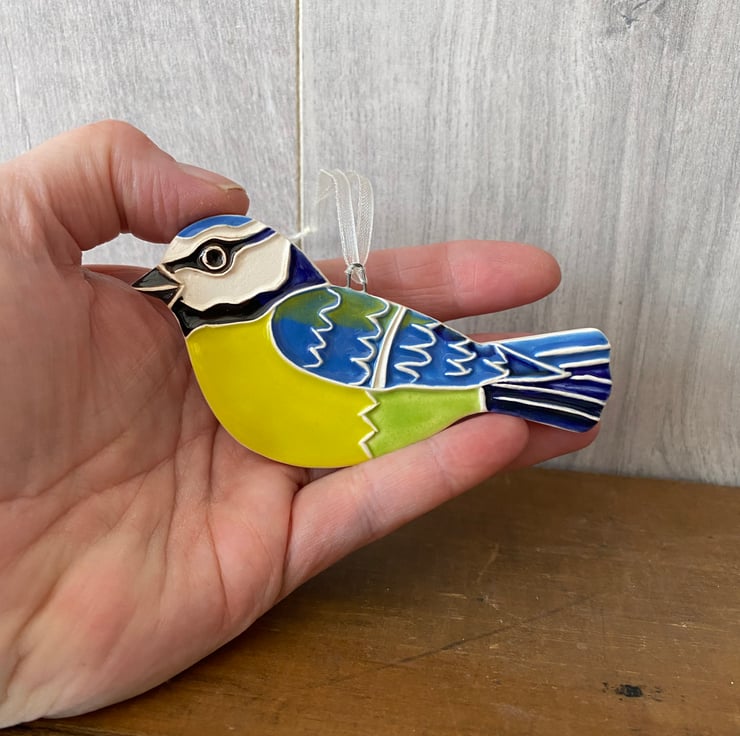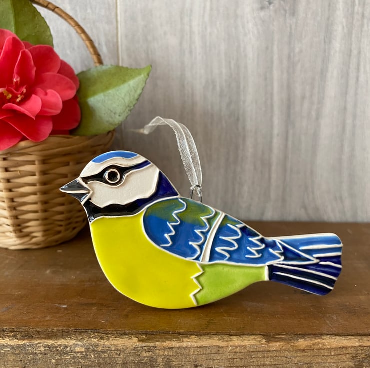 This ceramic bluetit decoration is made from white earthenware clay and finished with bold glossy glazes. It has been fired twice in an electric kiln. It measures 10cm x 5cm and hangs from a cream organza ribbon.