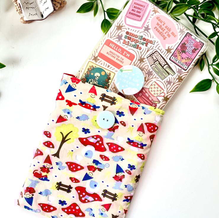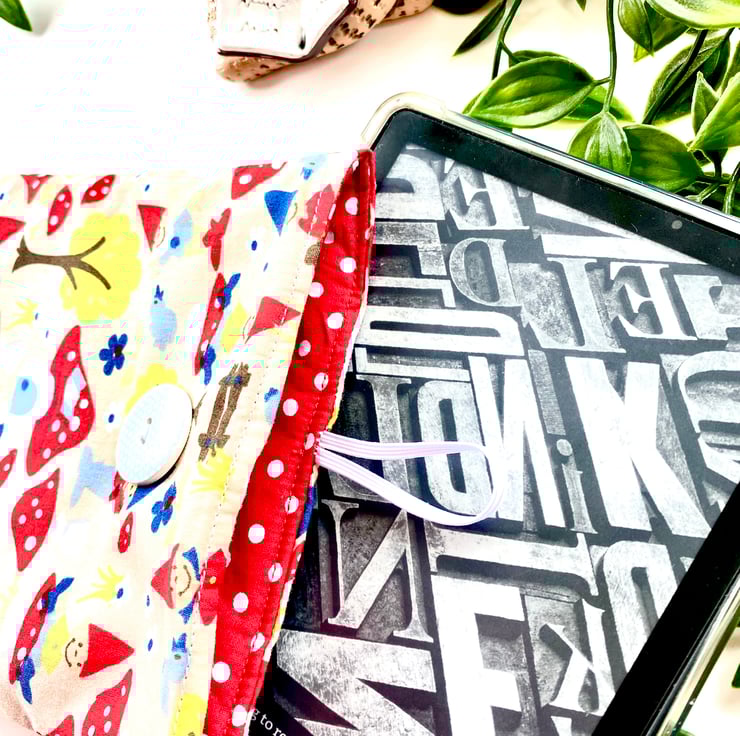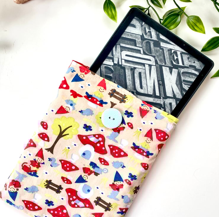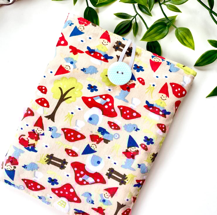 Handmade toadstool and gnome padded kindle sleeve / e reader case. It has a bright red and white polka dot cotton lining. This lovely fabric sleeve has been made to fit various sizes of kindles, please see below.