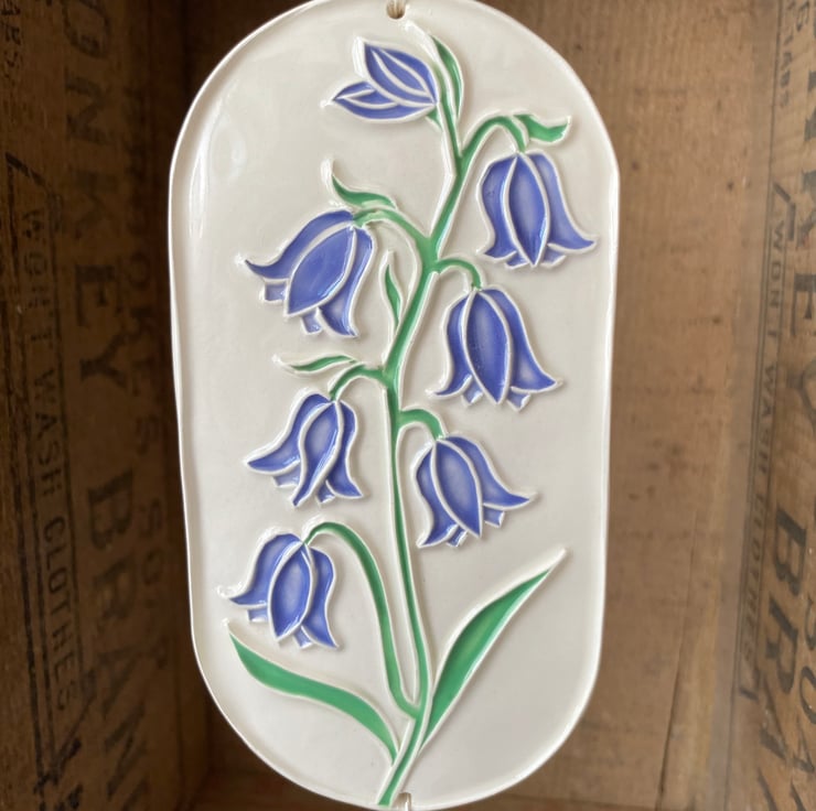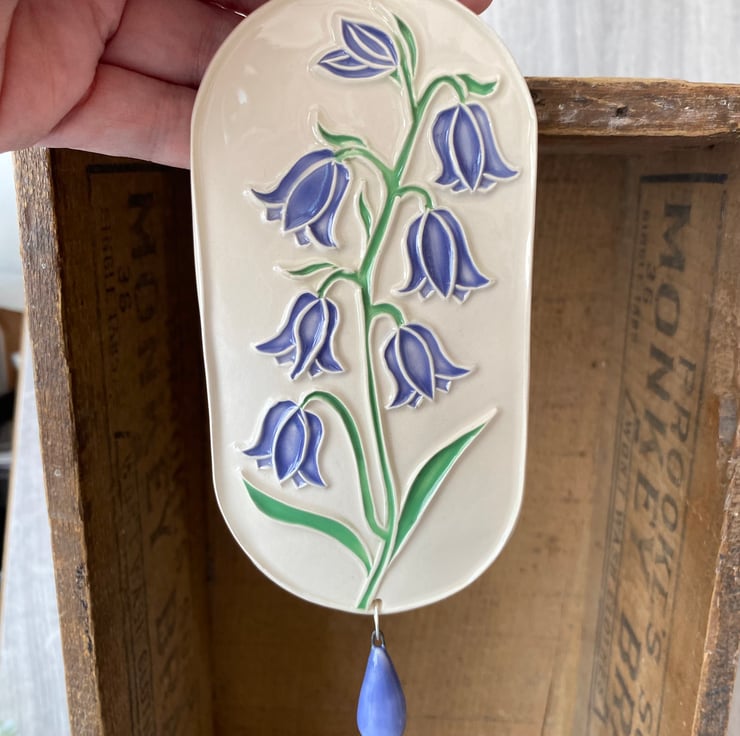 This bluebell hanging decoration has been made from white earthenware clay and imprinted with my own bluebell design. It has been fired twice in an electric kiln. It is finished with a matching dangly bead.