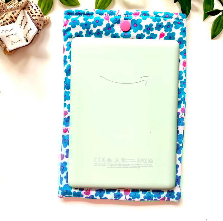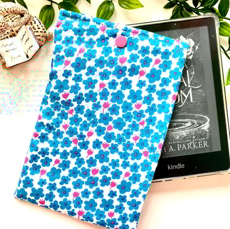 Handmade blue and pink floral padded kindle sleeve / e reader case. It has a pink cotton lining. It has a pink snap fastener to keep the kindle case closed.