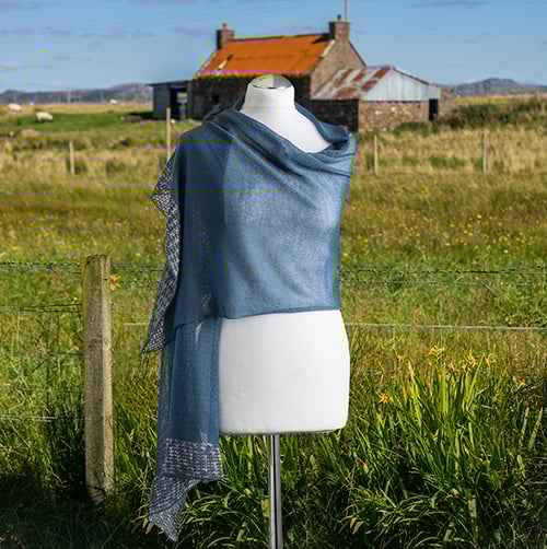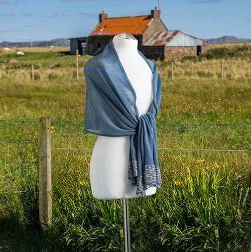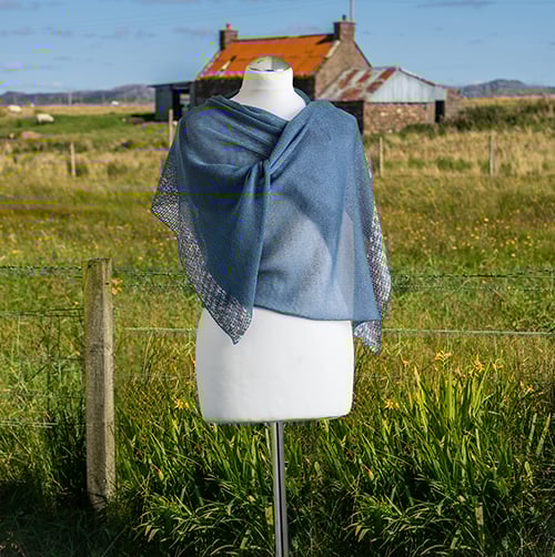 Super fine lightweight merino wool stole is the perfect cover up, but so light and fine can also be worn as a scarf. Knitted in a very fine merino wool in a denim blue colour with a contrast edging. The edging colour can be personalised to suit your outfit.