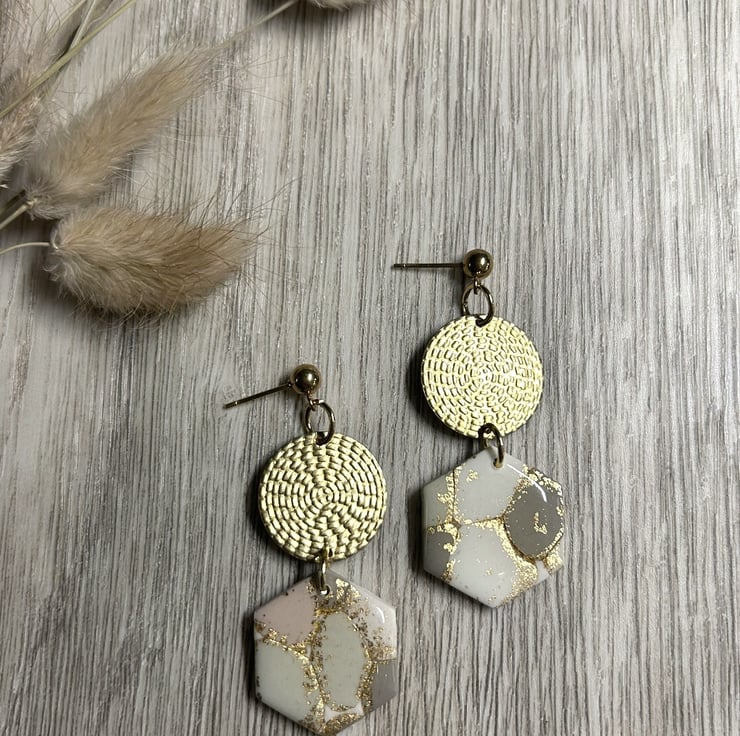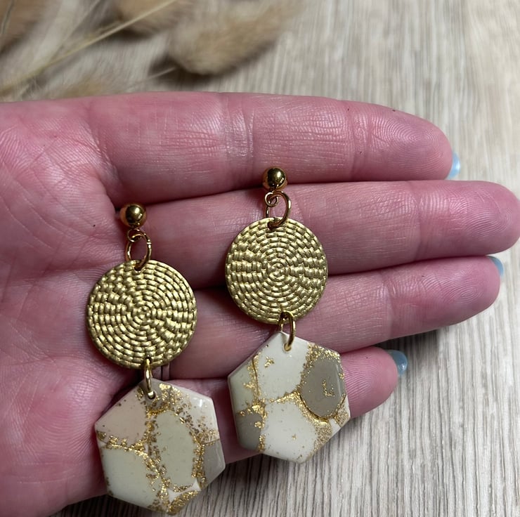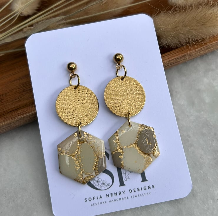 Elevate your jewellery collection with these elegant dangle earrings, meticulously handcrafted using polymer clay, gold leaf, and resin. The eye-catching design features a textured gold-tone circular disc paired with a hexagonal drop in soothing tones of beige, ivory, and gold. The marble effect, enhanced with shimmering gold leaf, creates a luxurious and organic finish that's truly one-of-a-kind.
