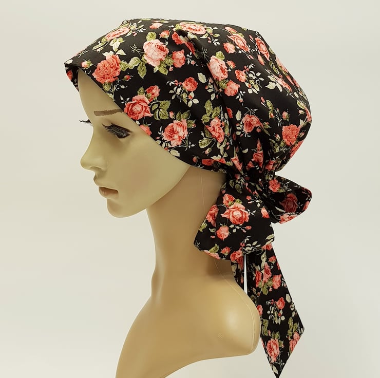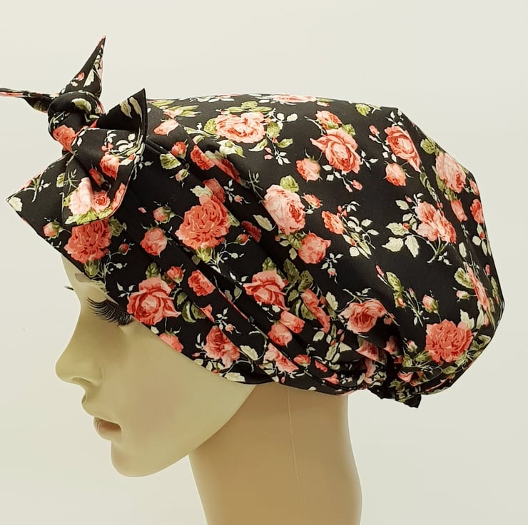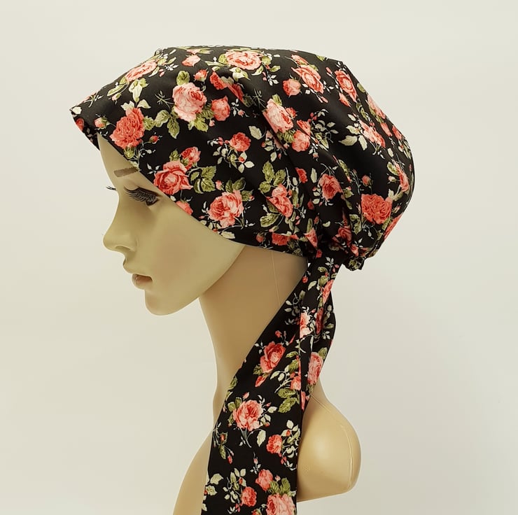 This is lined bonnet/head snood with long ties and built in elastic at the back of bonnet. This bonnet is made from 100% cotton fabric. Lined with lightweight cotton fabric.