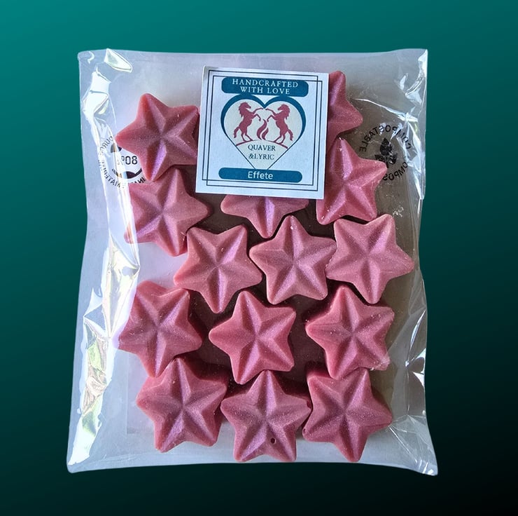 15 Star-shaped soy wax melts. Handcrafted in the UK with the finest vegan, responsibly sourced soy wax and Effete fragrance - Effete is an exotic fragrance with top notes of lavender supported by heart notes of myrrh and heliotrope. Each melt offers a fragrance that will linger for over 5 hours.