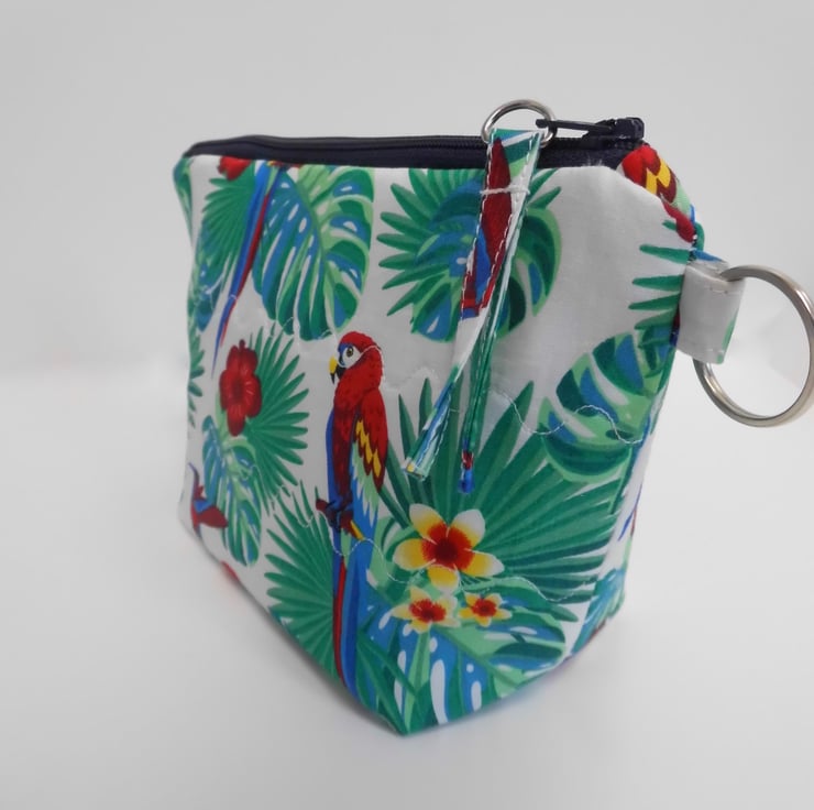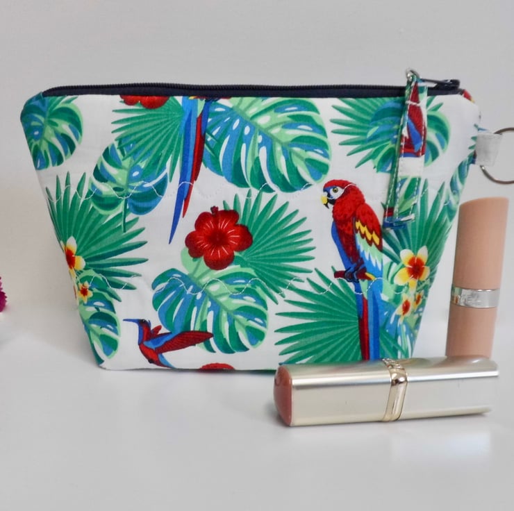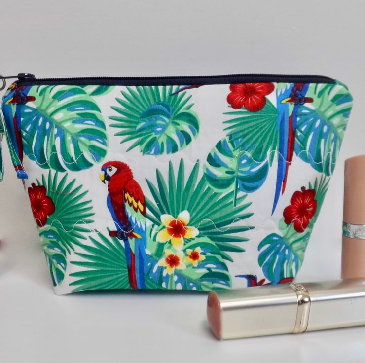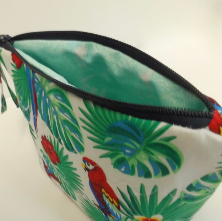 This make up bag is made with a quilting weight cotton printed with colourful parrots and tropical plants against a white background. I backed the fabric with fusible fleece to give it extra body and a quality feel and there are three lines of wave stitch on each side. It is lined with aqua colour cotton fabric which has a silvery shimmer.