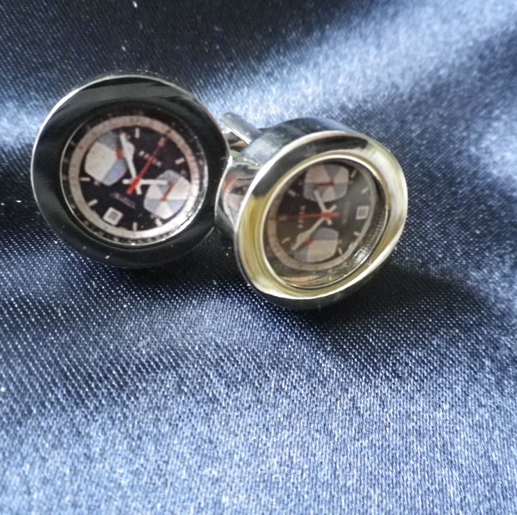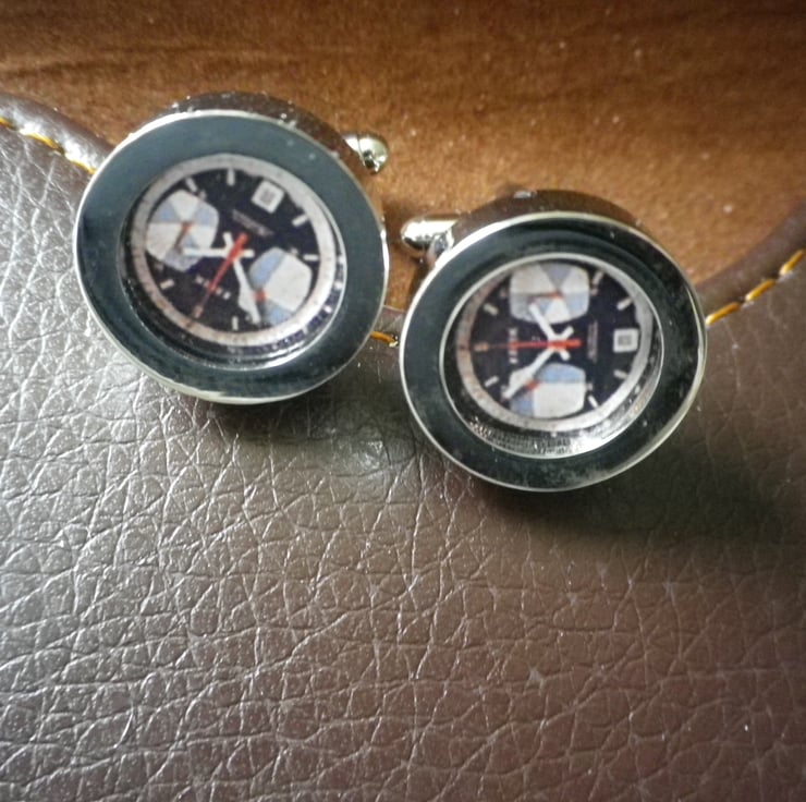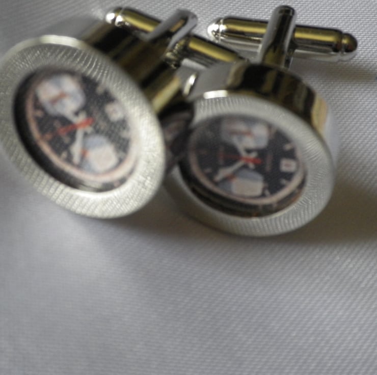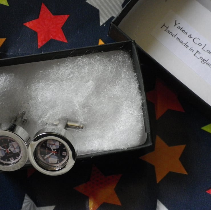 Part of a collection of vintage and retro 1930s to 1960s digital image watch face cufflinks......They pay tribute to the often overlooked dedication, craftmanship, and beautiful designs of the period. The cufflinks are highly polished stainless steel, with a deep 3mm setting, and 12mm width protected by a perspex disc, plus you will receive your purchase gift wrapped with free shipping