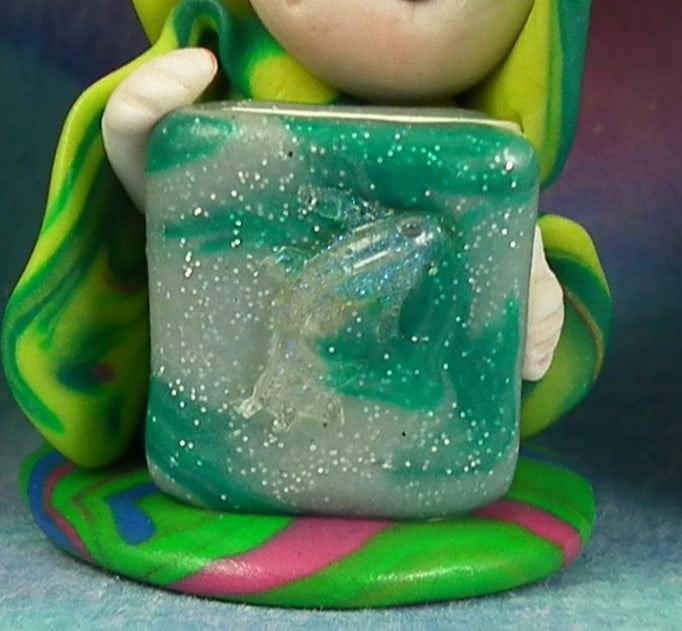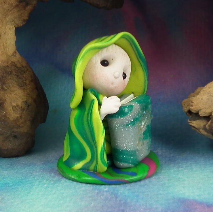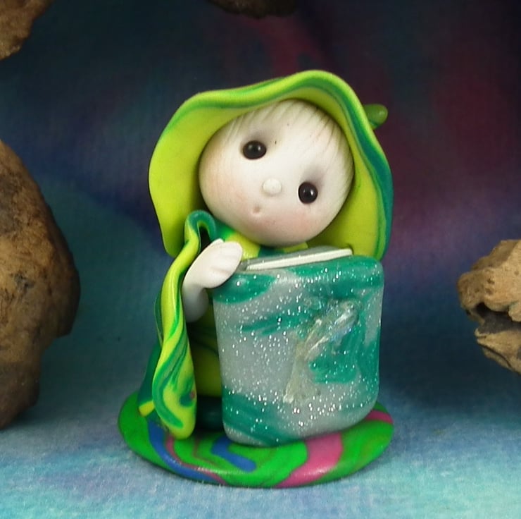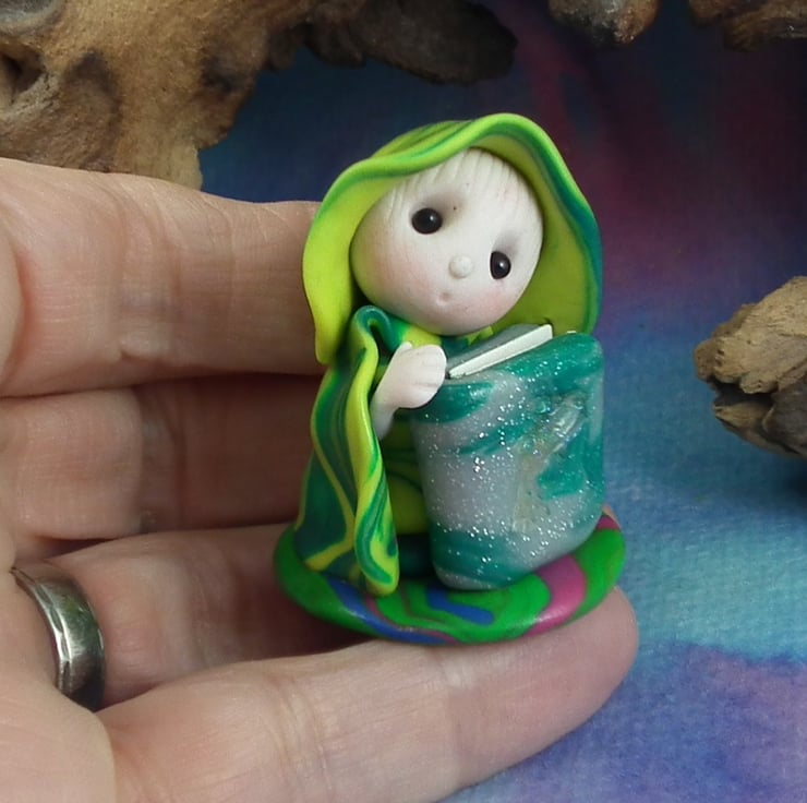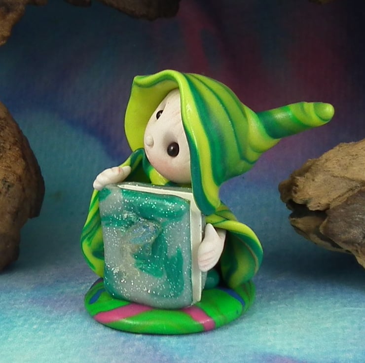This is a 'one of a kind' creation having been entirely handmade without the use of moulds here at my studio on the Sussex Coast. Modelled with artist blend polymers, blushed before sealing with lacquer, Gillen has sparkling black onyx eyes and a large fishy storybook. Gillen the Library Gnome is just one and a half inches tall.