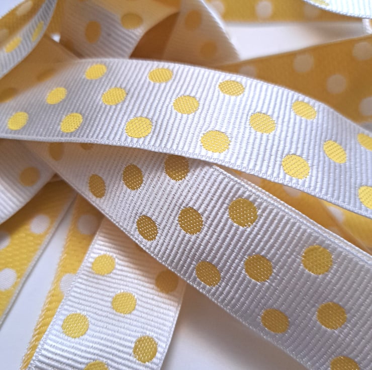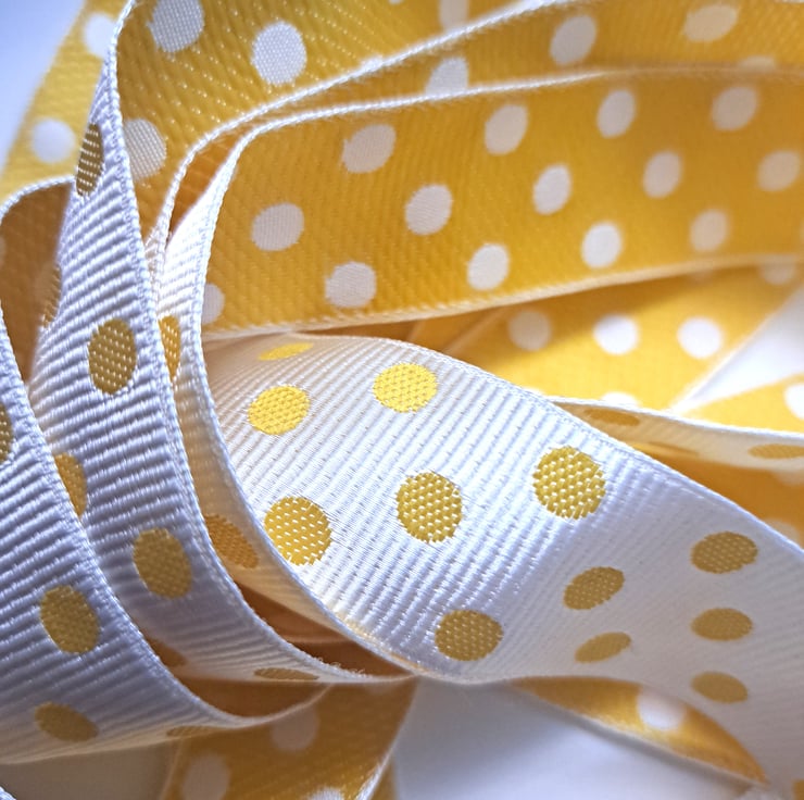 2.5 metres of bright yellow and white spotty polyester ribbon with a slight satin sheen, which is 25mm wide. I think it is supposed to be white with yellow spots, but in my opinion it could be double faced