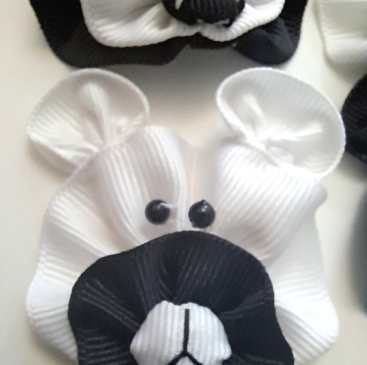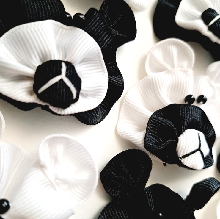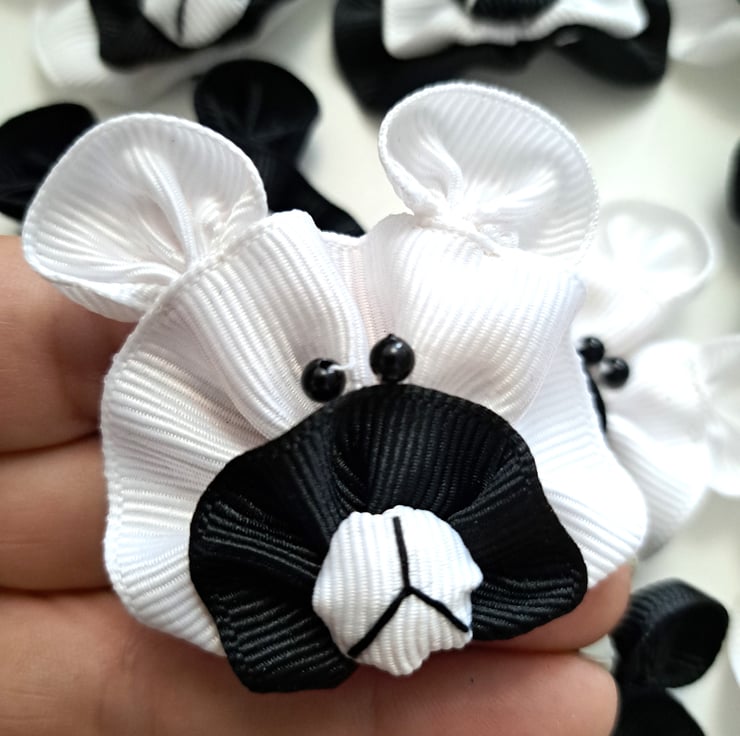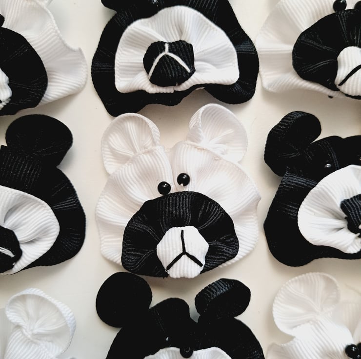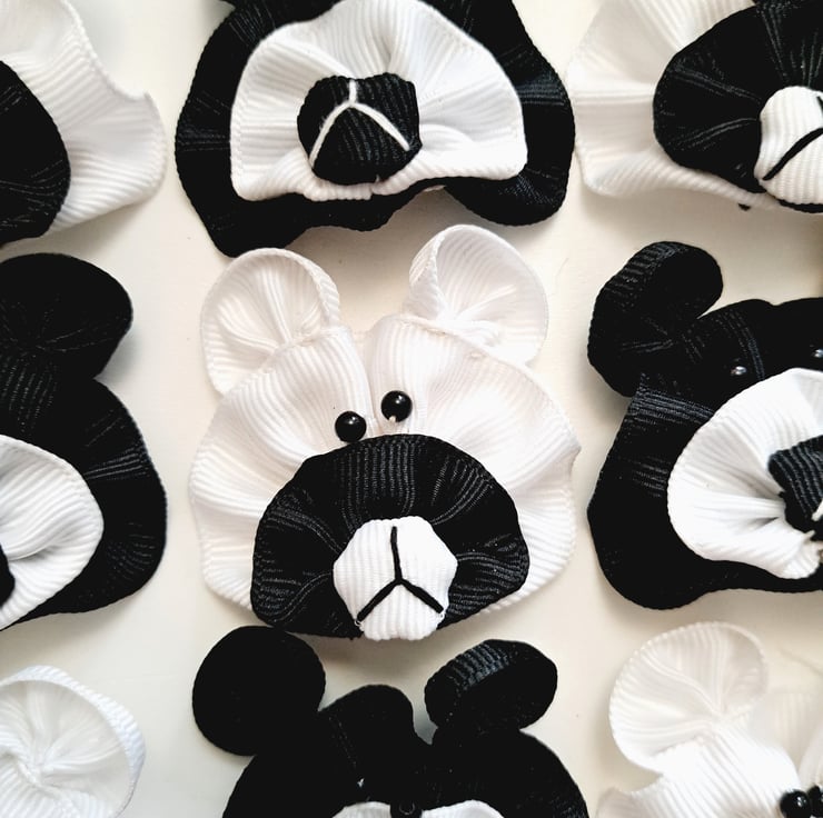 A pack of 10 x black and white ribbon bears with bead eyes, approximately 50mm wide. These are fabulous for sewing crafts, scrapbooking, card making, and generally for embellishing most craft work. Made from grosgrain ribbon.