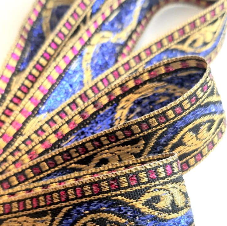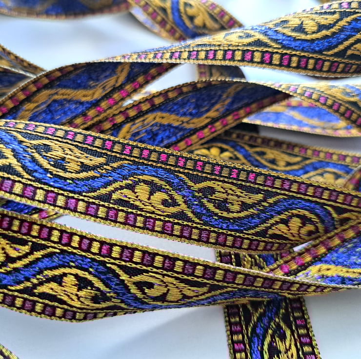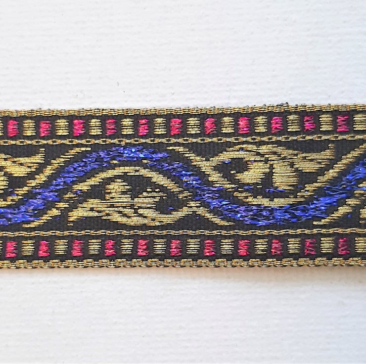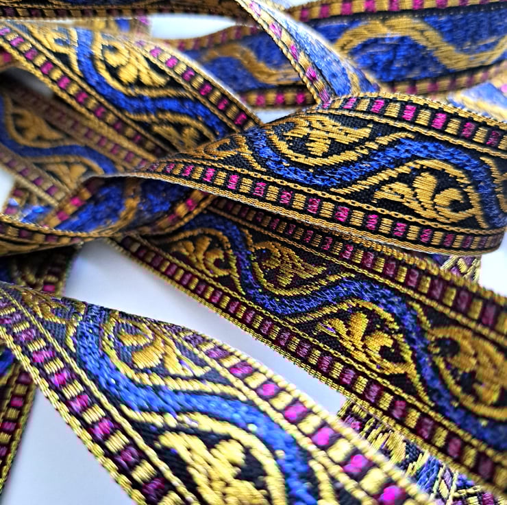 4 metres of blue, red and gold polyester ribbon, with a lovely acanthus leaf and wave pattern, which is 20mm wide. Single faced.