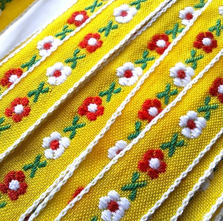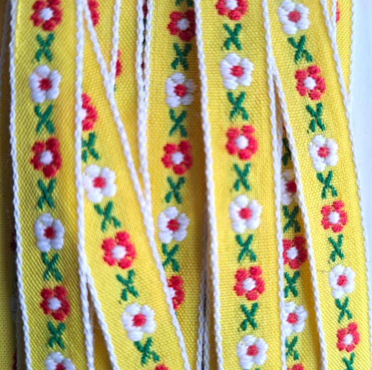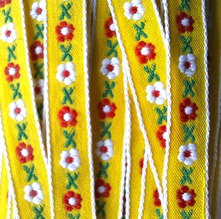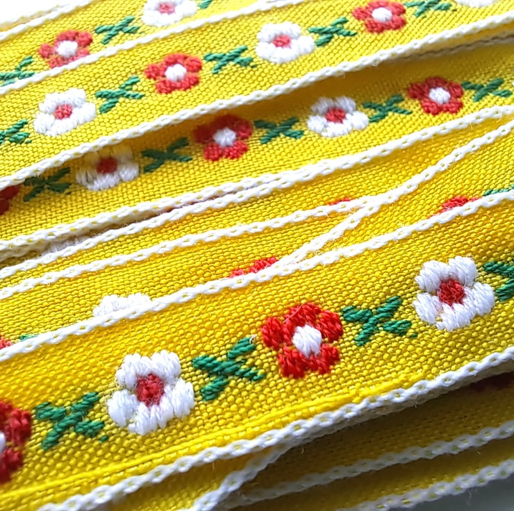 Selling in 1 metre lengths - bright yellow embroidered cotton ribbon with red and white flowers, which is 11mm wide. Single faced.