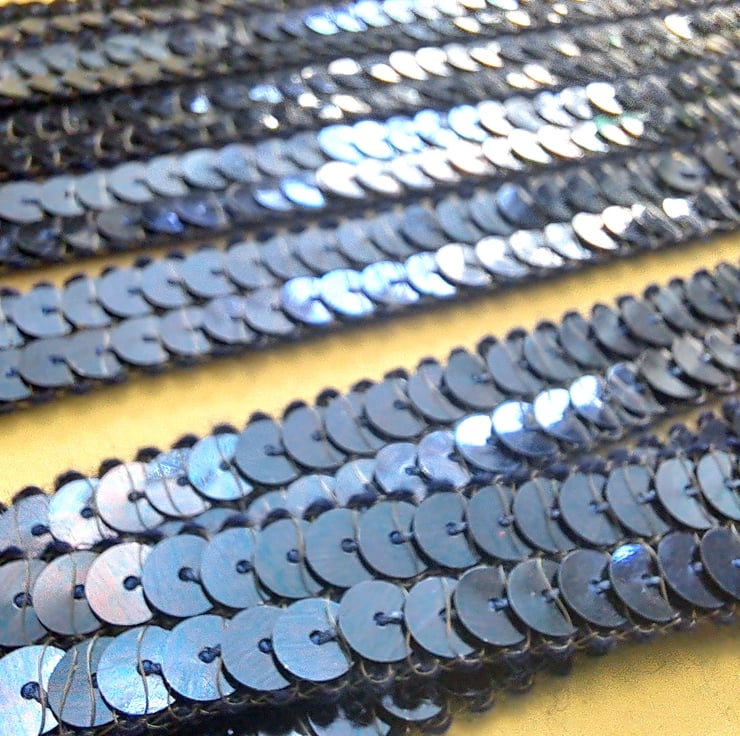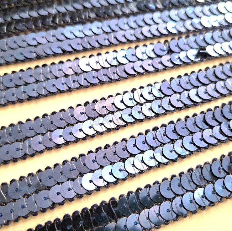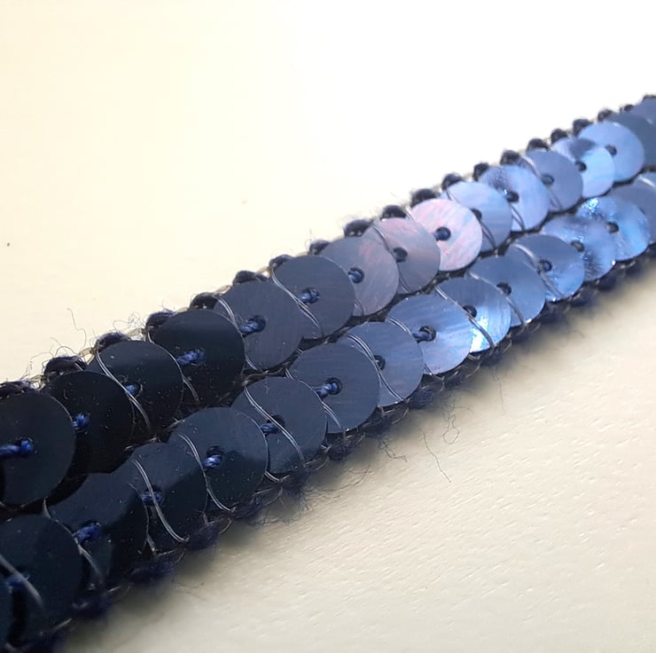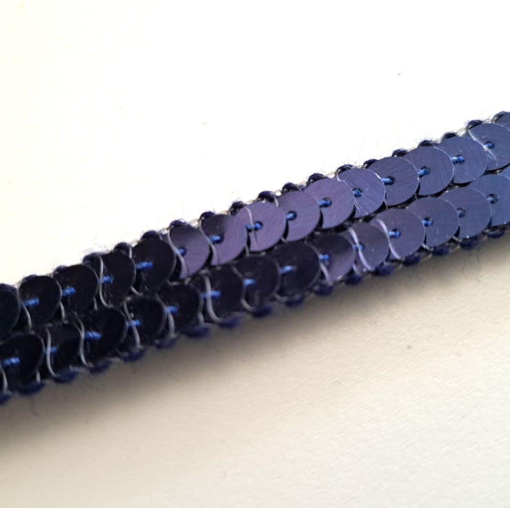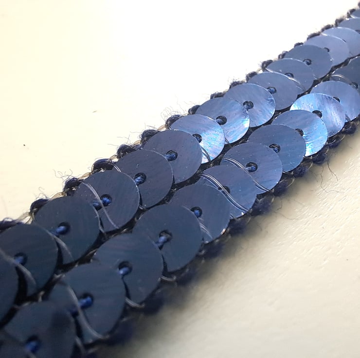 4 metres of blue sequinned braid, in a double row, which is 19mm wide. Single faced.