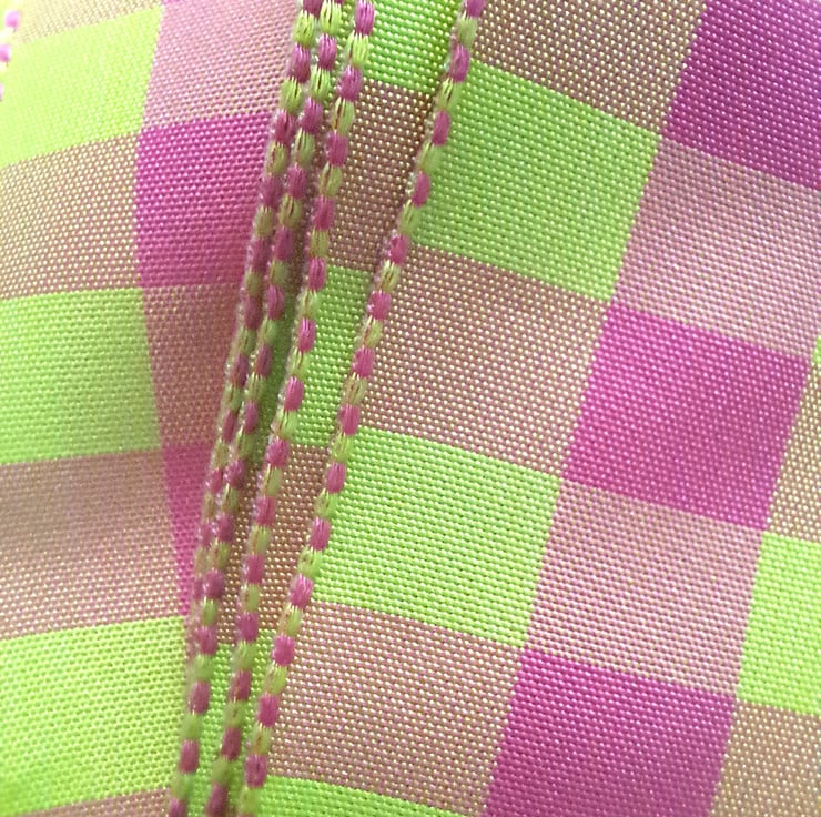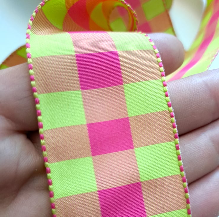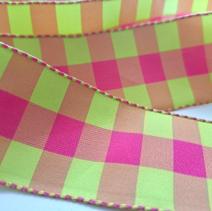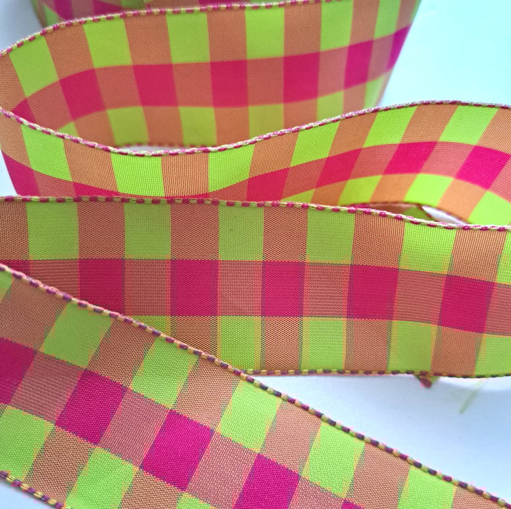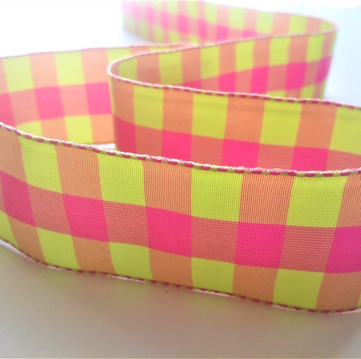 2.5 metres of bright pink and green checked polyester ribbon, which is 36mm wide.
