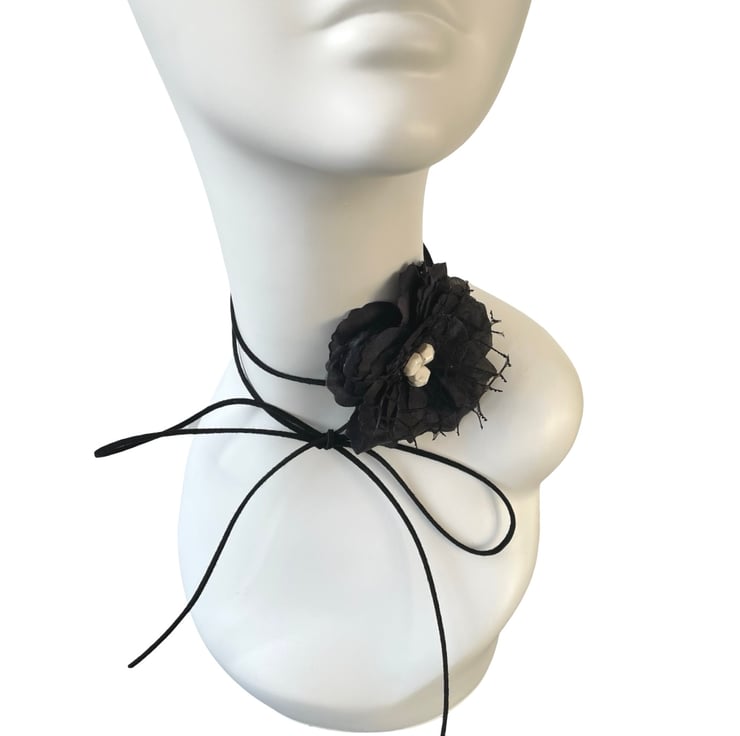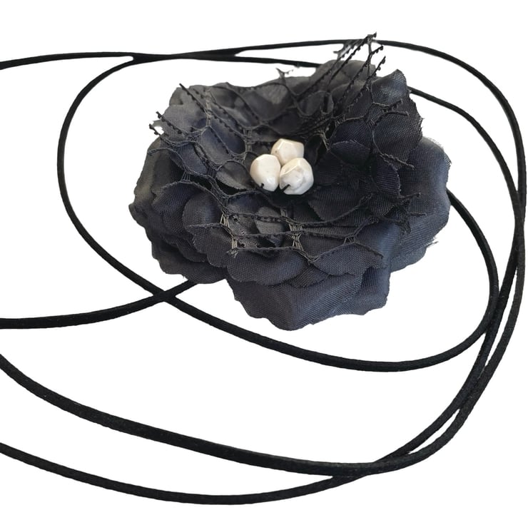 Black flower corsage tie choker necklace with howlite gemstone crystal for women
