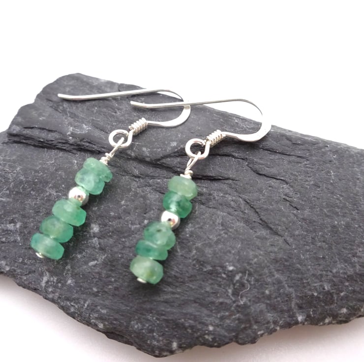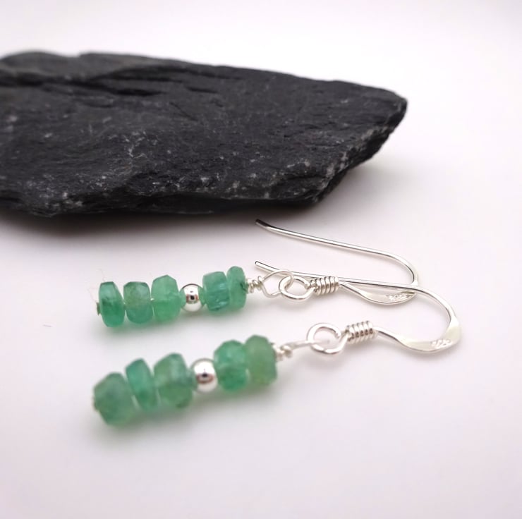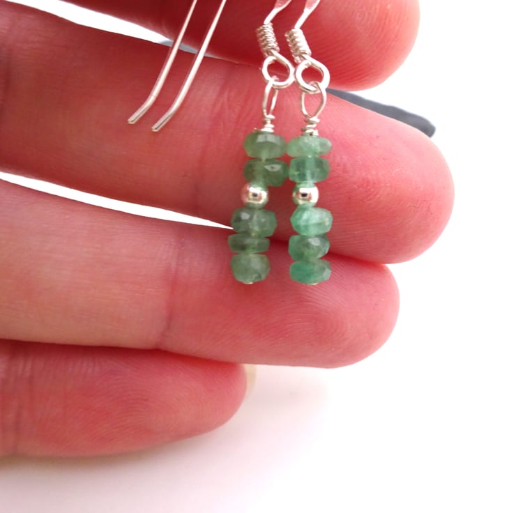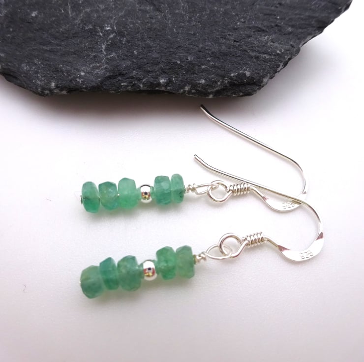 A pair of sterling silver earrings which feature Emerald gemstone beads and sterling silver beads.