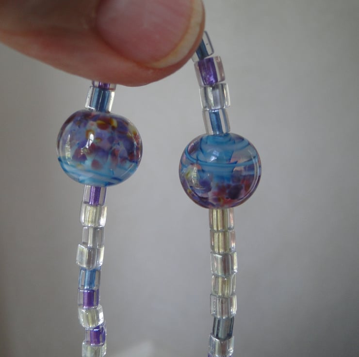 Each bead has a swirling blue ribbon on 1 side with a multi coloured frit on the other. 1.2 mm diameter.