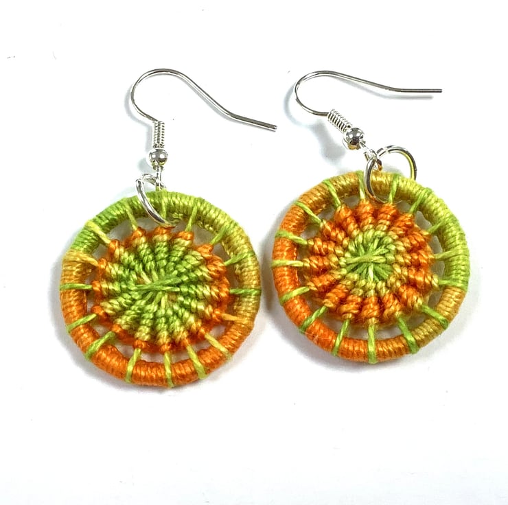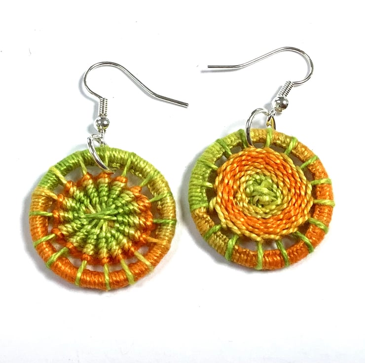 These earrings have been made by wrapping Perle cotton thread around a metal ring. The rings measure 2.3cm and hang from silver plated earwires.