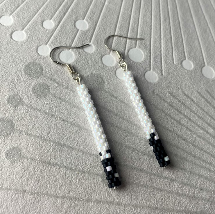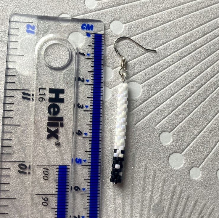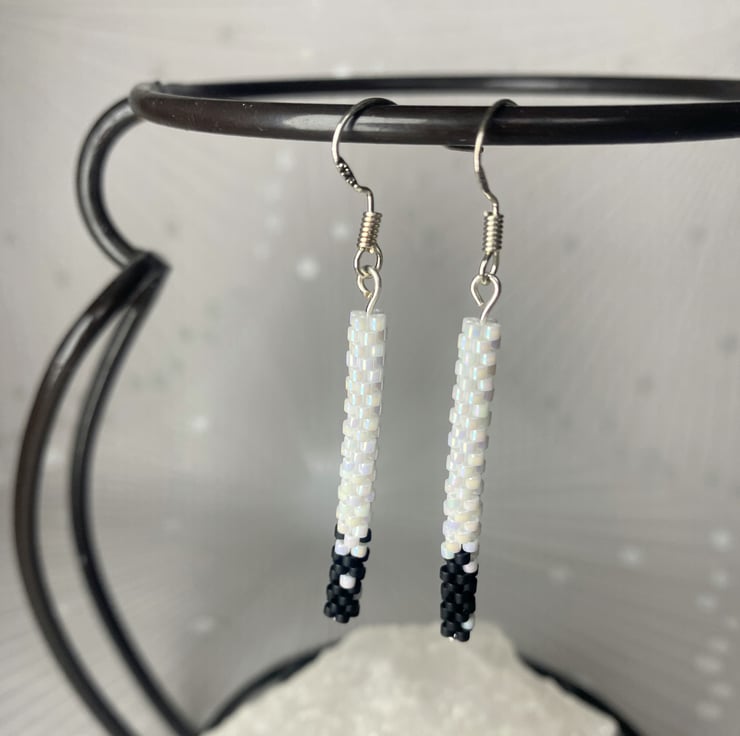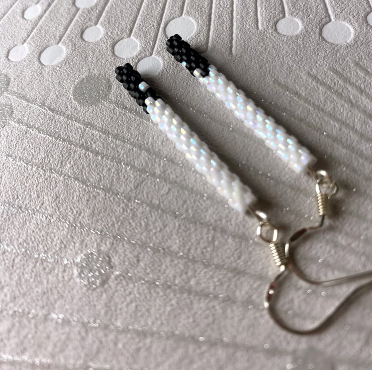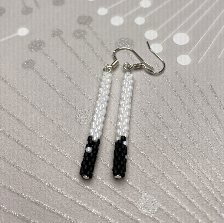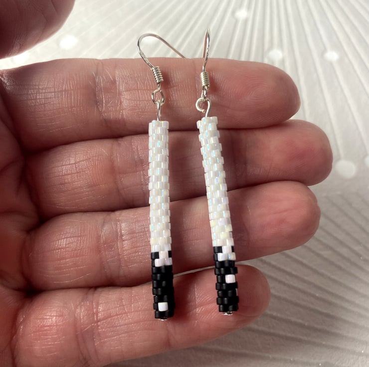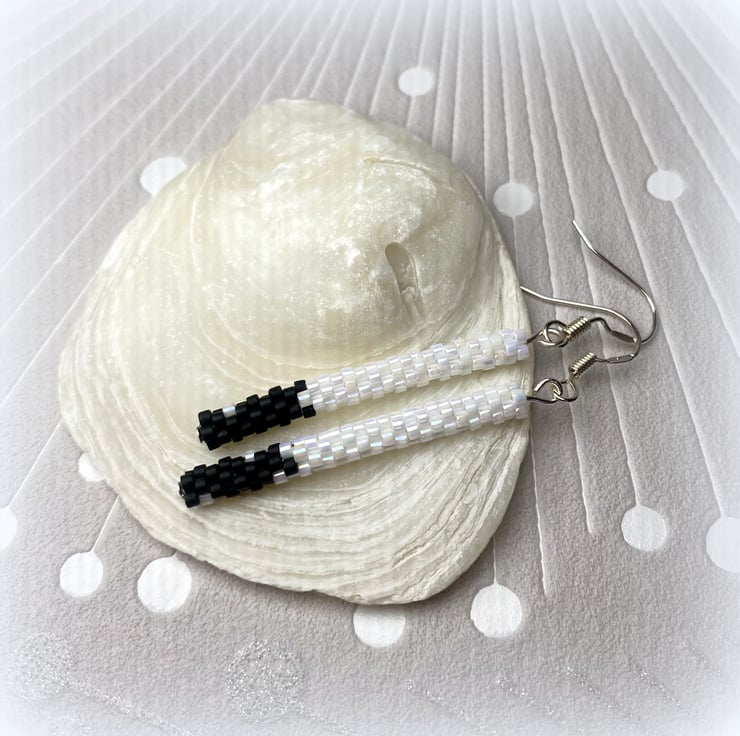 Complete your look with these delicate black and white dangle earrings, handmade to echo the simplicity. Each pair features handwoven beads of pearl white with little black details handwoven from Mijuki Delica beads suspended from sterling silver hook.