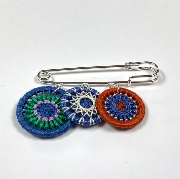 This silver coloured pin measures 7.5cm and from it hangs a 3cm and a 2.5cm Dorset Button plus a 2.5cm Zwirnknopfe button (middle button). The buttons are made by winding Perle cotton thread around a metal ring.