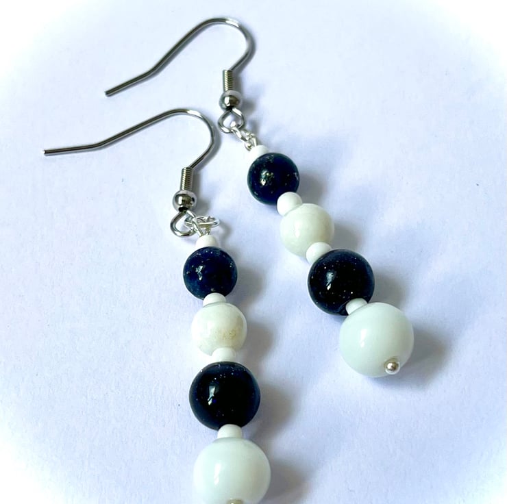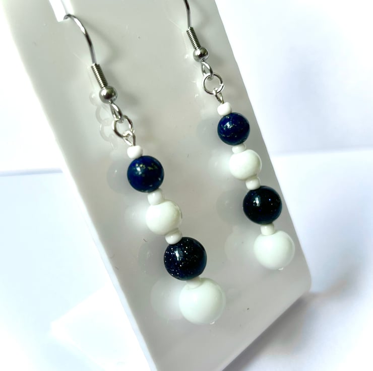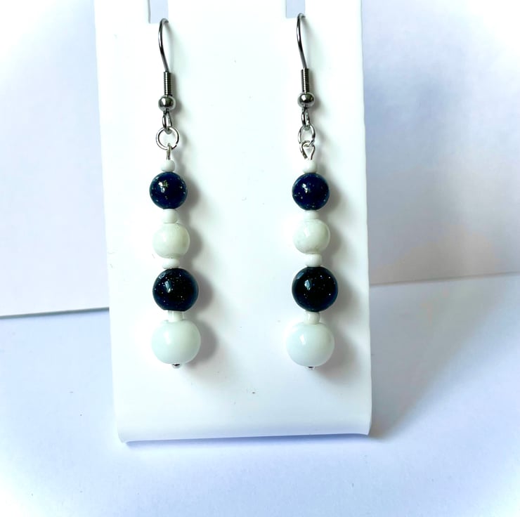 Dangly earrings made using 4 beads reducing in size. White glass beads and dark Navy Blue Goldstone beads on stainless steel ear wires.