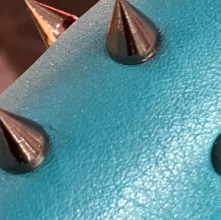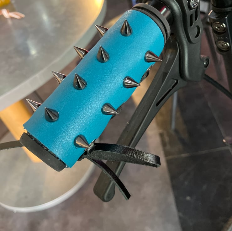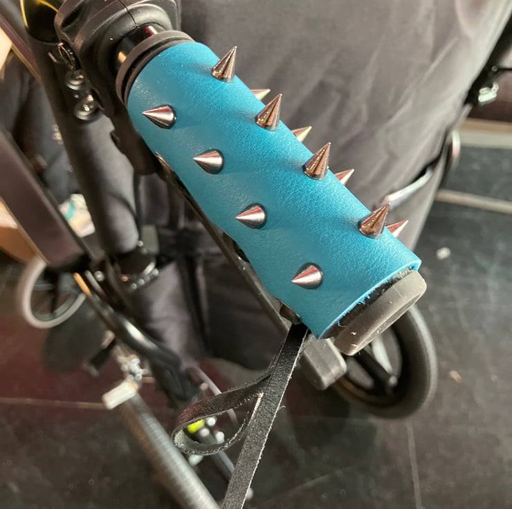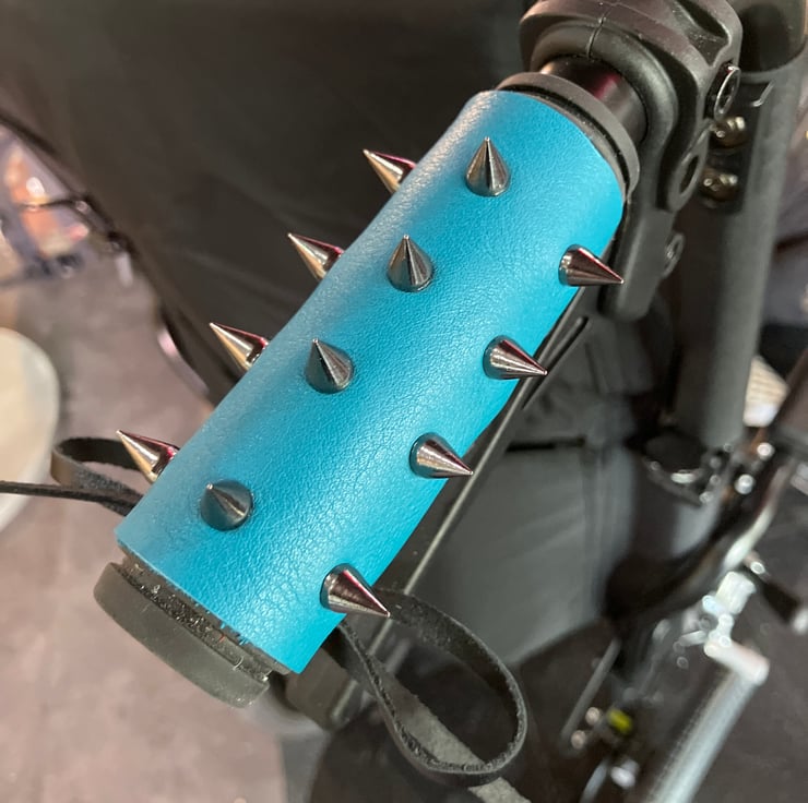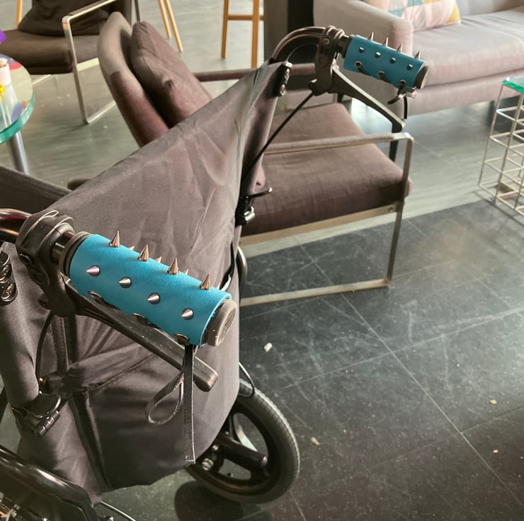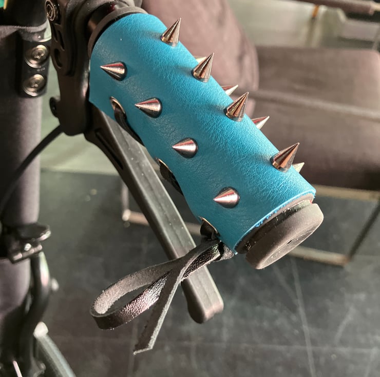 Teal Blue Leather Wheelchair Handle Deterrent (WHDs) with Gunmetal Coloured Spikes - Keep Unwanted Hands OFF Your Wheels