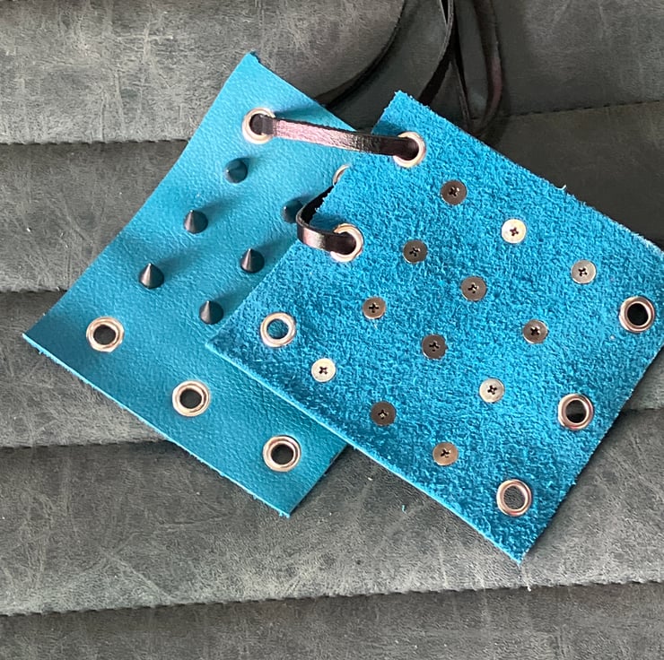 The specs on these WHDs are quite simple. They measure 9cm X 10cm. The teal blue leather is a soft 2.0 oz leatherweight, with 12 gunmetal coloured 7mm spikes/cones strategically placed on each WHD (that's 24 in total). A leather lacing is given for each WHD. (sold as a pair)