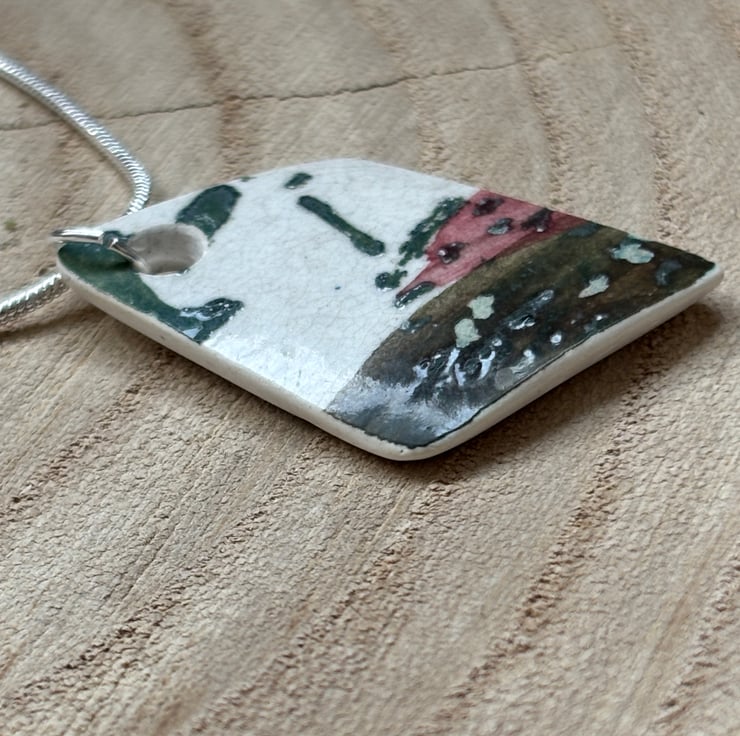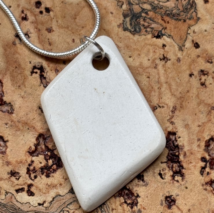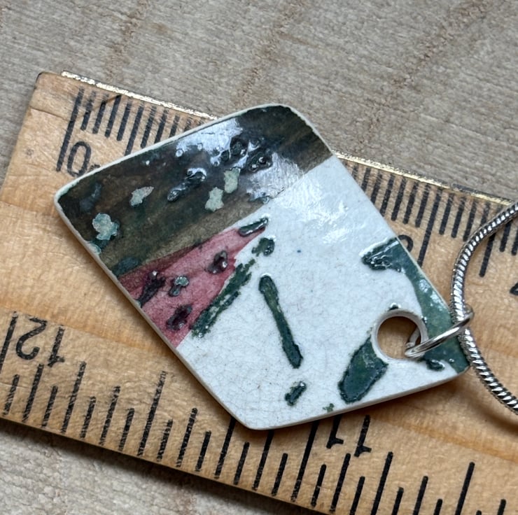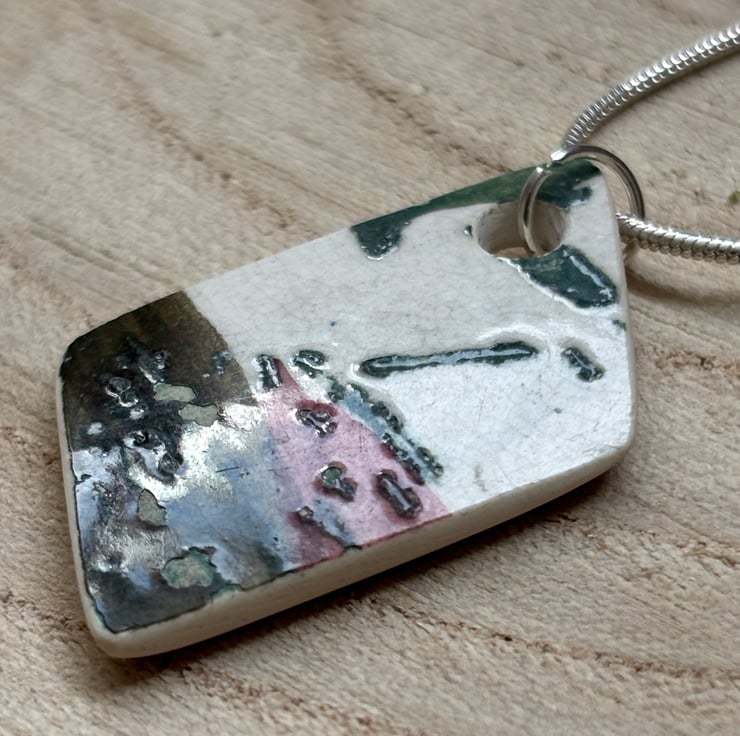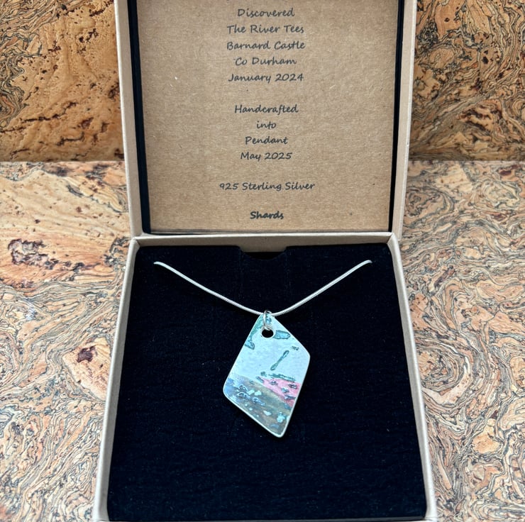 In January 2024 I cam across a striking piece of ceramic beside The River Tees, Barnard Castle, green with a bit of pink. The glaze was damaged so after a thorough clean I stored the shard. I came across it while having a clear out and decided to try a new technique. I make and polish everything by hand, over time I’ve discovered different ways of sanding and smoothing, creating distinctive unusual pieces. I polished the glazed surface which sealed the broken glaze giving the ceramic a unique texture. The shard is slightly curved, I followed the general shape and the result is a striking pendant.