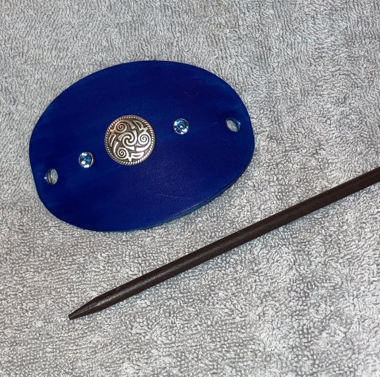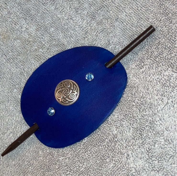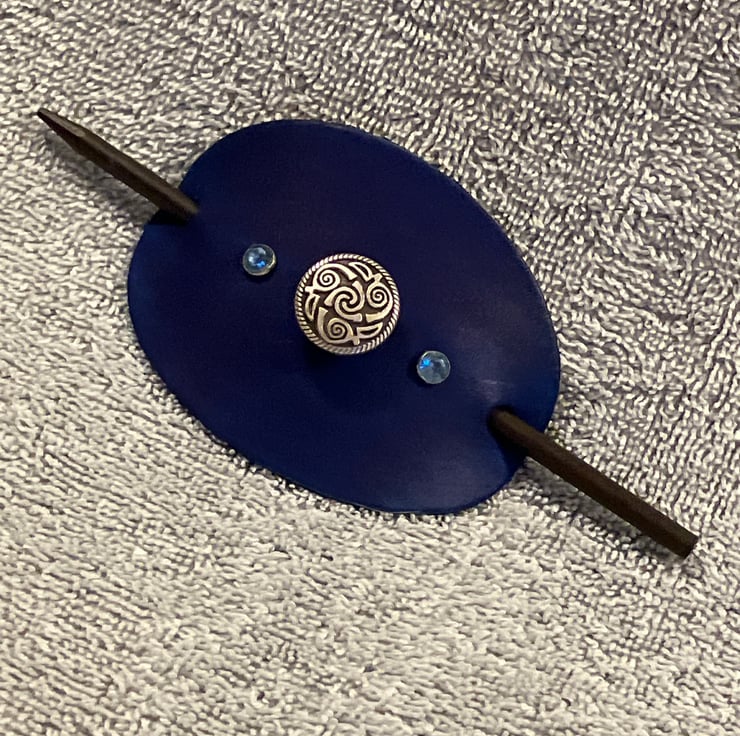 Blue Leather Hair Stick Barrette with Celtic centre with 2 Blue Gemstones