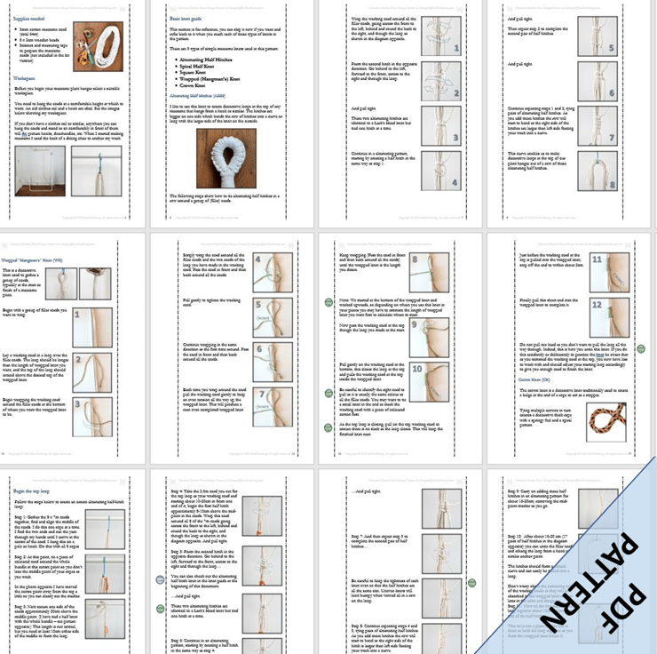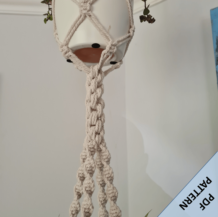 Designed and photographed by ButOneString. The PDF document contains detailed instructions, lists the materials needed, and a step by step guide to complete the project with over 100 colour photographs. Suitable for beginners, the pattern includes a basic knot guide and step by a step instructions.