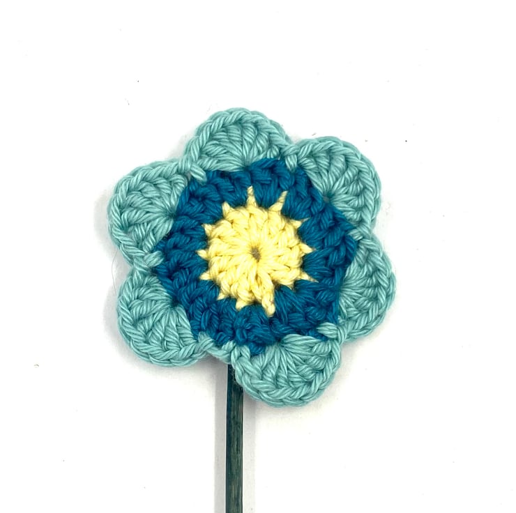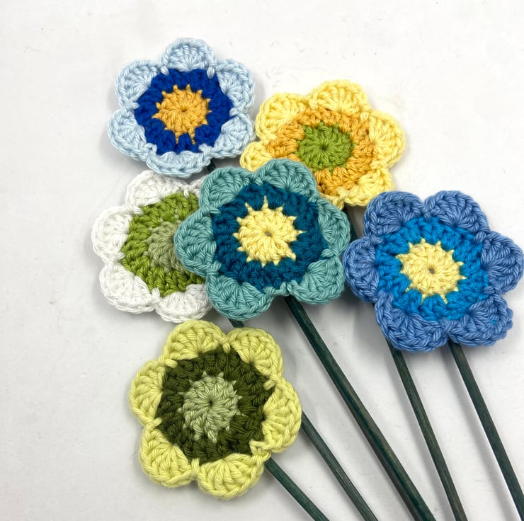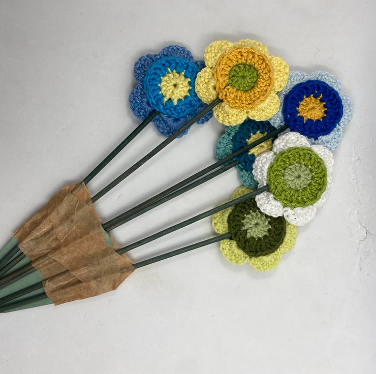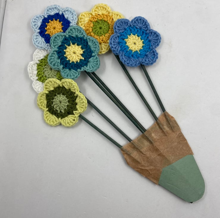 This bouquet of happy fantasy flowers would make a great alternative to a greetings card. Afterwards the flowers could stand in a vase, be added to a house pot plant or two or used to decorate gifts for others . The flowers are crocheted in cotton and firmly attached to dyed bamboo canes. They centres at the back of the flowers match the front so that the flowers are pretty much reversible. The flowers measure between 15 and 25 cm tall. They are attached with tape to a piece of card to hold them in place and this has then been wrapped in decorative paper to complete the bouquet. The attached label reads, ‘With all my Love’ although I am very happy to exchange this tag for one with wording of your choice. The bouquet comes wrapped in tissue in a labelled PIP ( Postage in Proportion) box, all ready to be given or posted on.