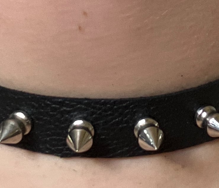 3/4" width -- soft black leather choker with 5 spikes riveted onto the choker.