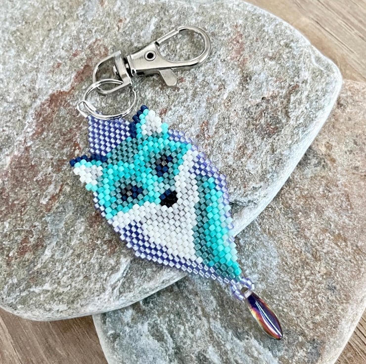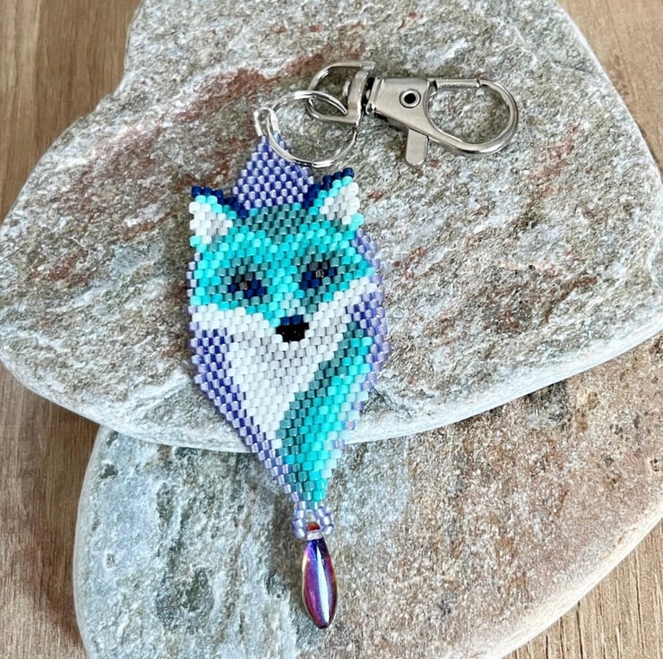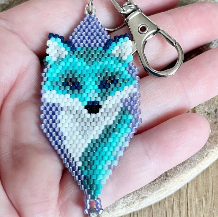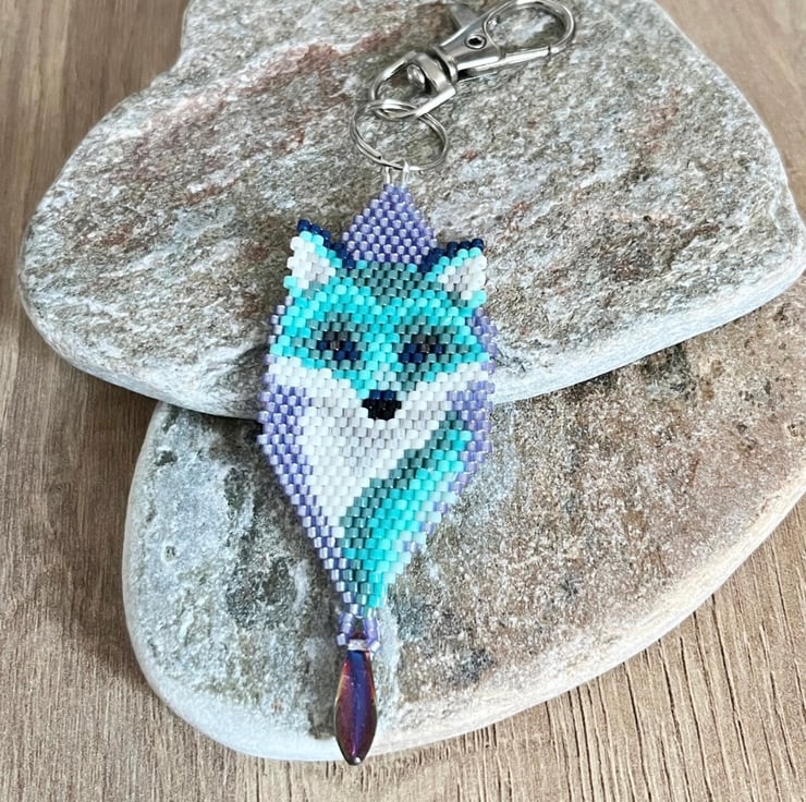 This colourful hand woven beaded bag/key charm has been handmade by me using tiny glass Japanese Miyuki cylinder beads. The beads have been woven together in an elongated triangle shape in the image of a blue fox. The colours of the fox are all different shades of turquoise blue/greens, cream and silver and the background is a shimmering lilac colour.