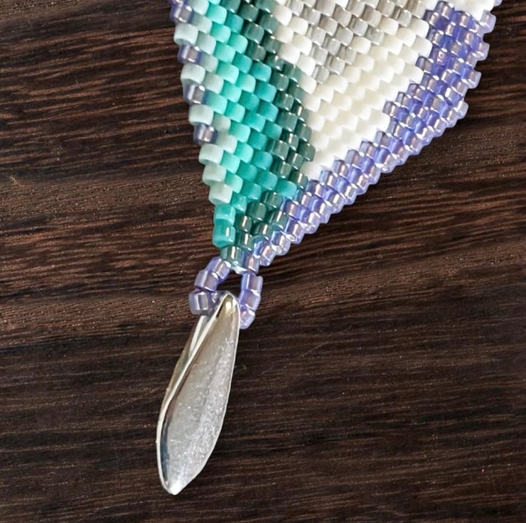 Hanging from the base of the beadwork is a Czech glass dagger bead in iridescent purple tones on one side and silver on the other.
