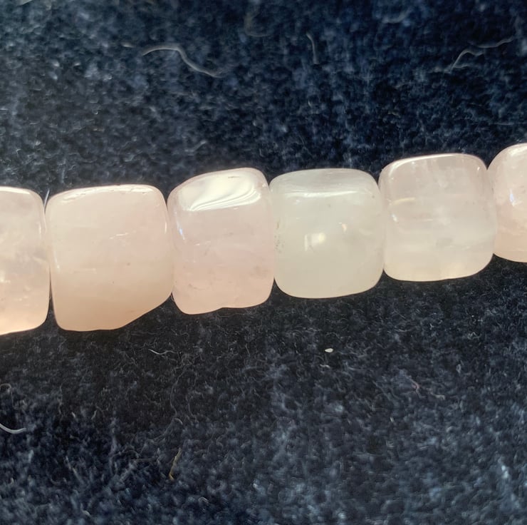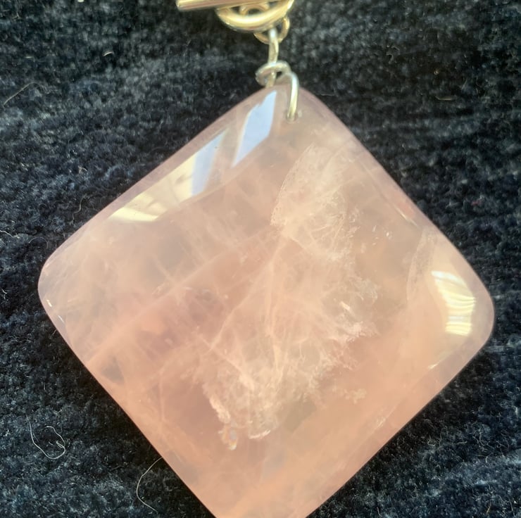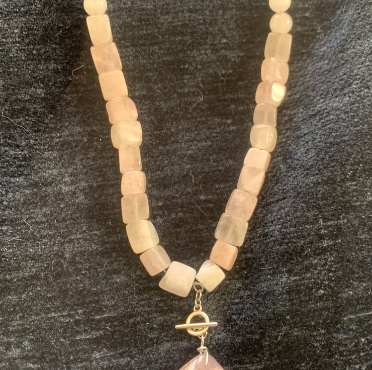 Rose Quartz cubes and rounds leading to a huge cabachon with a magnetic clasp.
