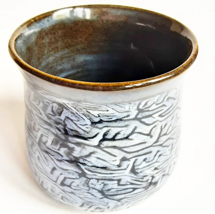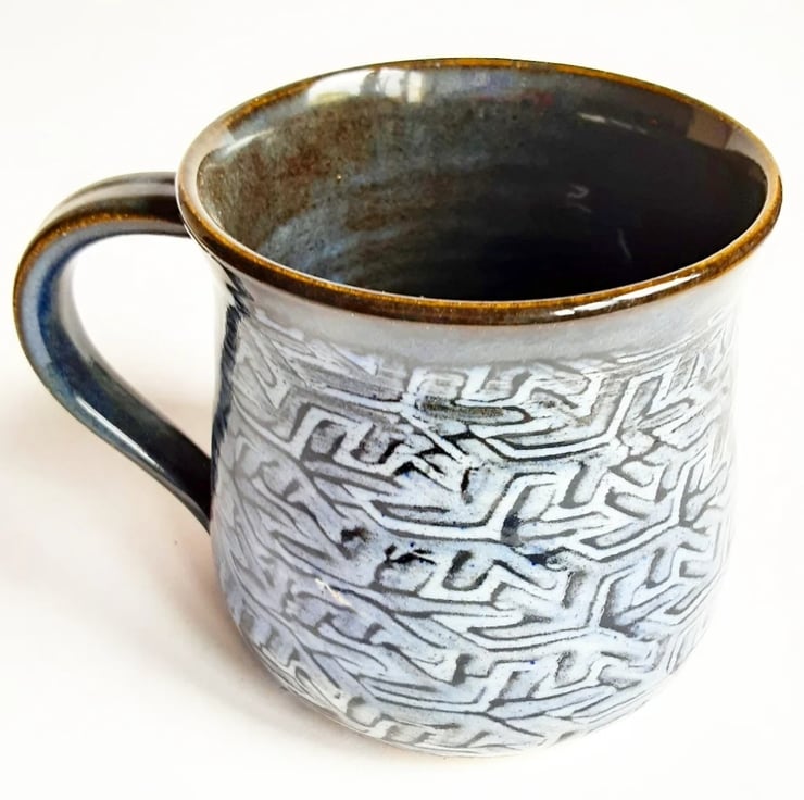 Glazed in blue glazes with a pattern on the mug.