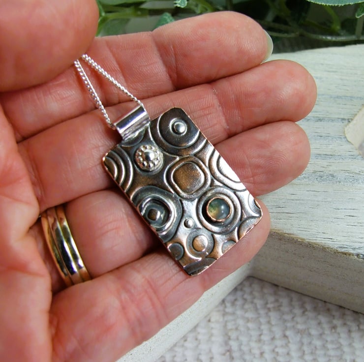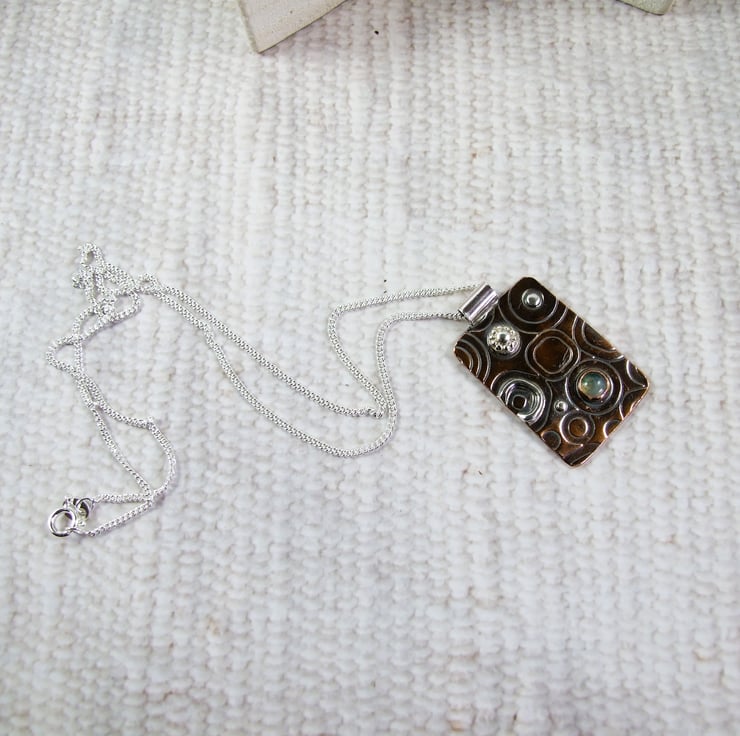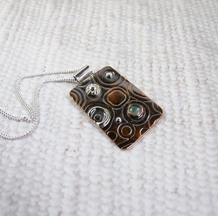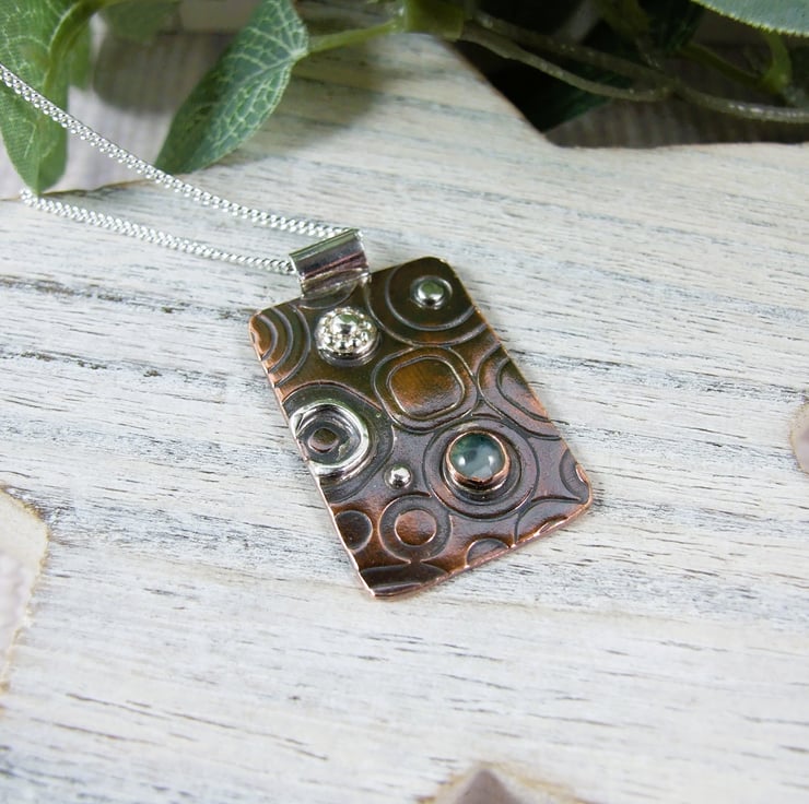 I have used copper for the base, cut from 1mm thick sheet and embossed with a geometric pattern. I have added silver accents and a little silver flower to enhance the geometric pattern and set with a small 5mm moss agate gemstone. Fitted to an 18 inch .925 Sterling Silver chain.