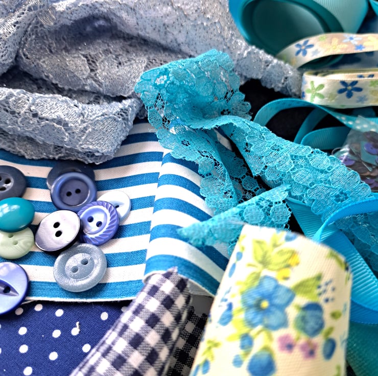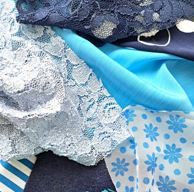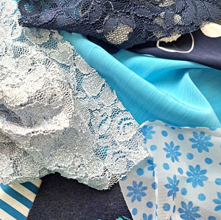 This bundle has a lovely blue colour theme. Each bundle is very slightly different but you will receive mostly of what is in the photos. The variations are with the cut of the fabrics and one of the smaller pieces. The fabrics are a mixture of old or unused cotton, synthetic, beautiful sequinned stretch lace, and other materials.