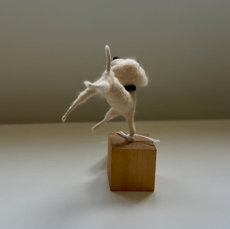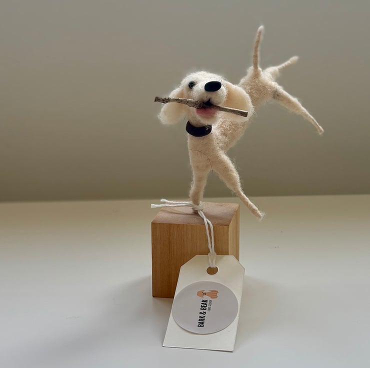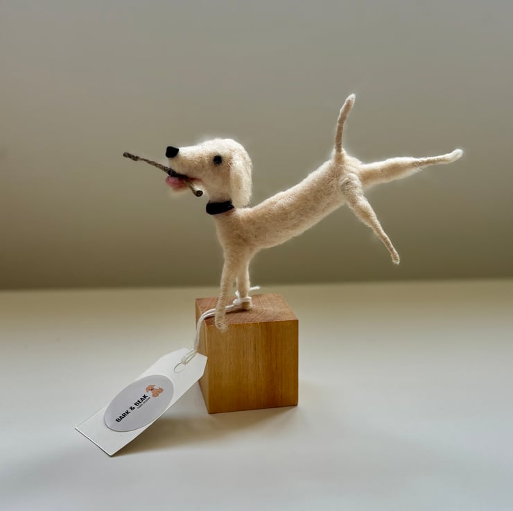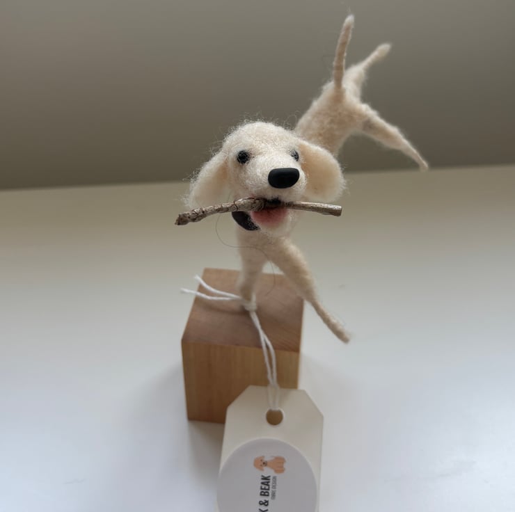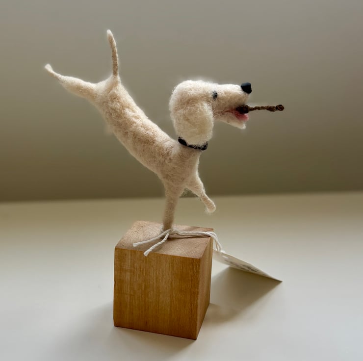Handmade needle felt whimsical white dog, proud of his stick, made with wool. . The perfect collectible for someone special, just to say you appreciate them. Mounted on a wooden block. Height 10cm tall including block