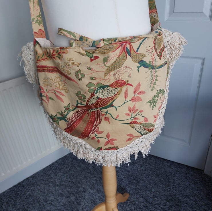 Boho bag handmade using vintage curtain fabric and a cotton 3" crocheted fringe. Sizes are 16 " wide x11" in depth. Strap is approx 57" in length. Bag is fully lined and has centre ties.