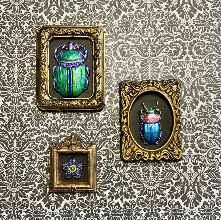 Inspired by natural history cabinets of curiosity. I look to emulate on a much smaller scale. Sustainable and ethically made, these collections will add a touch gothic elegance to any wall or bookcase.