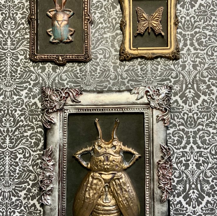 Inspired by natural history cabinets of curiosity. I look to emulate on a much smaller scale. Sustainable and ethically made, these collections will add a touch gothic elegance to any wall or bookcase.