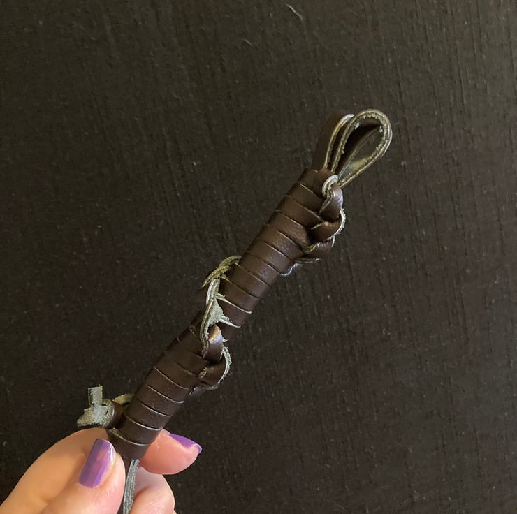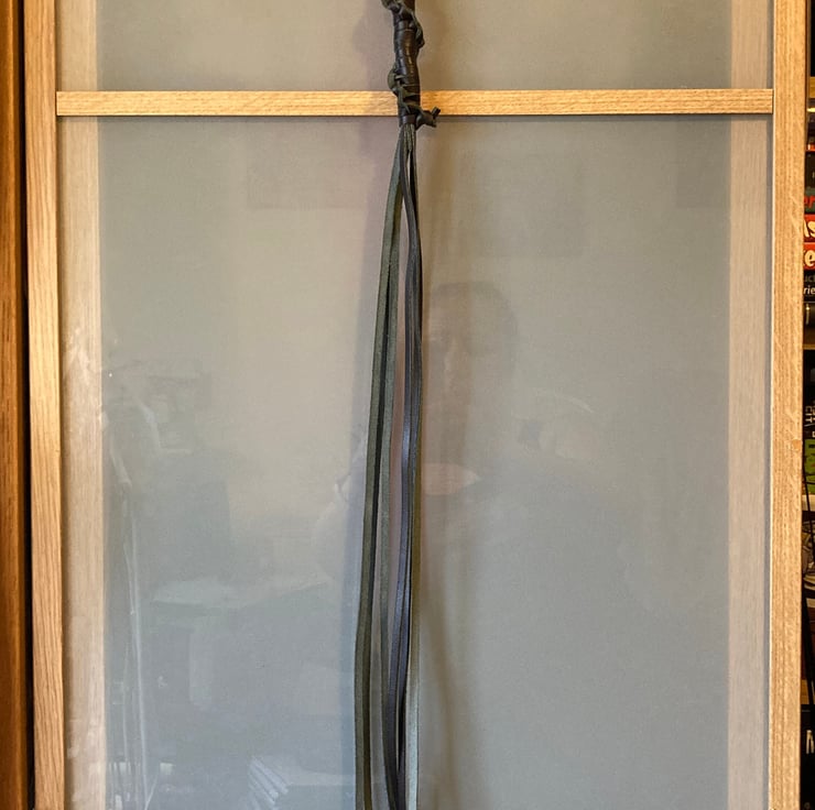 Hand wrapped Leather Lace Mini Whip in Dark Brown (top) & Dark Green (underside)(almost blackish) (slightly textured) coloured Leather Lacing (roughly 18 inches in length from bottom of handle).
