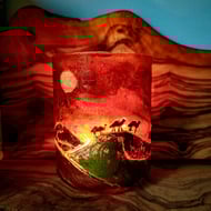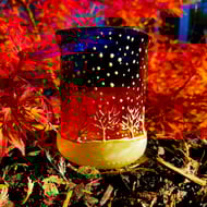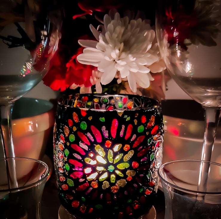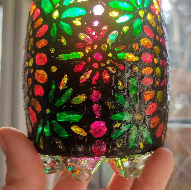 It is a wonderful piece to add to your cosy home decor and very hygge thing to have. It works great as a standing sun catcher but even better as a tea light lantern to cast colour shadows around. This glass painted candle holder would make a great housewarming gift or a birthday gift for a traveller.